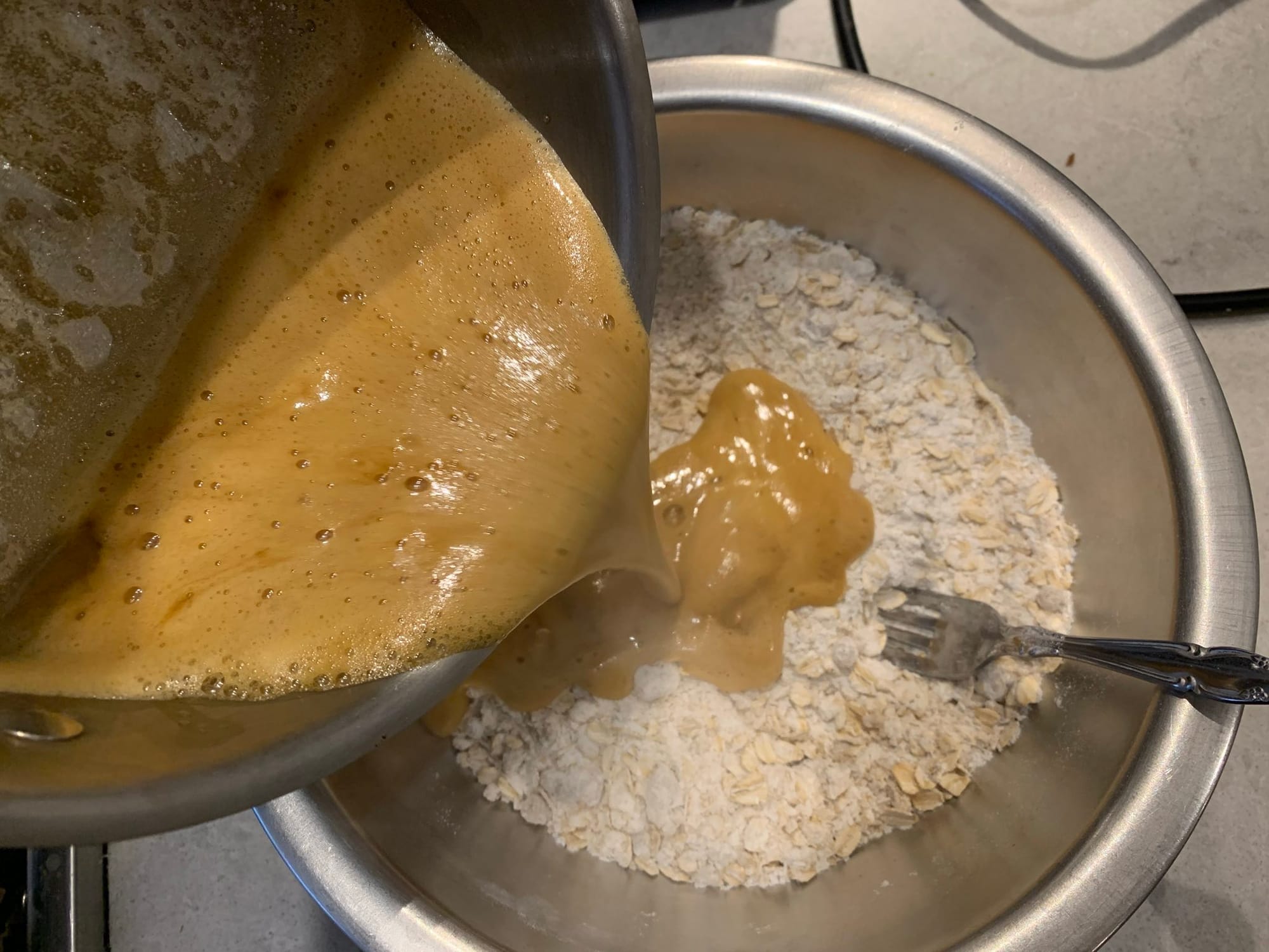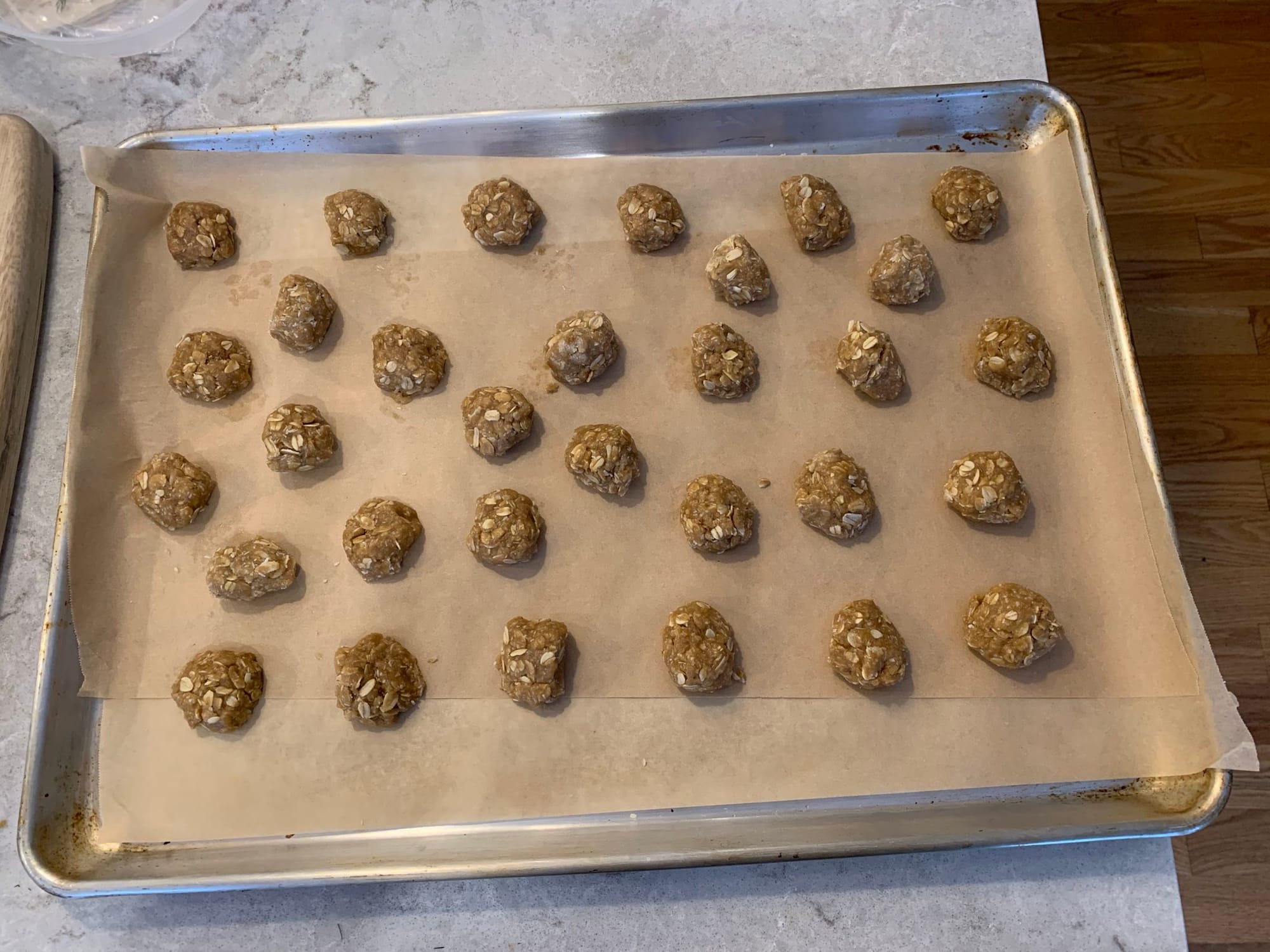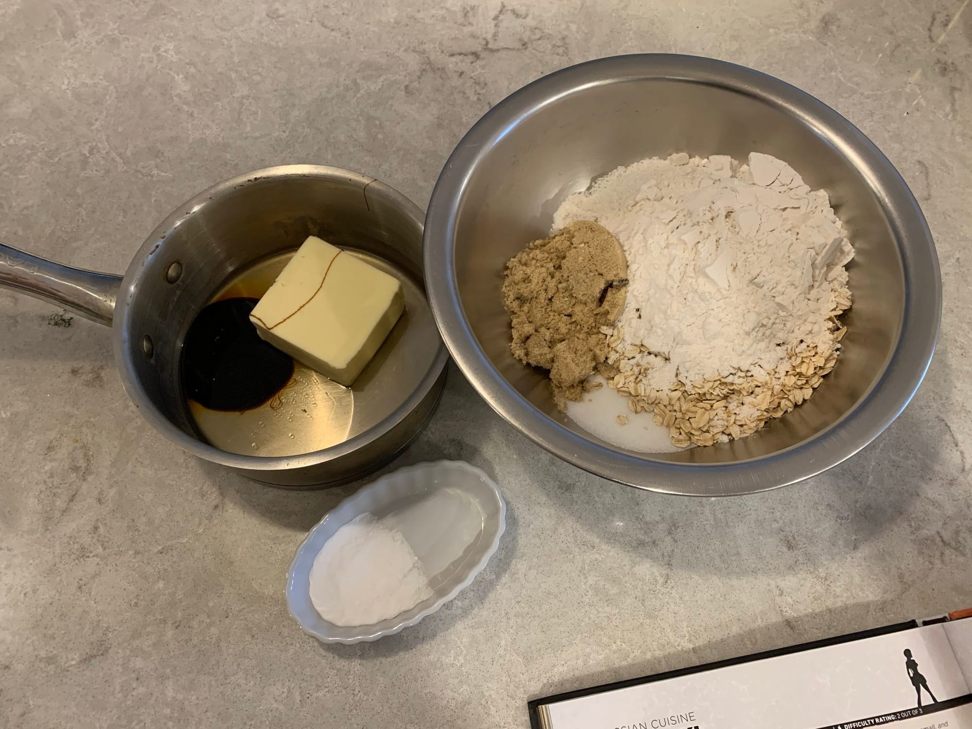 I had to make a substitution for both golden and corn syrup since I lacked them. The recipe says that if you don't use golden syrup, you can use a tablespoon each of corn syrup and honey. Instead of corn syrup, I used molasses. Some traditional recipes for Anzac Biscuits call for molasses anyway, so it isn’t that big of a stretch.