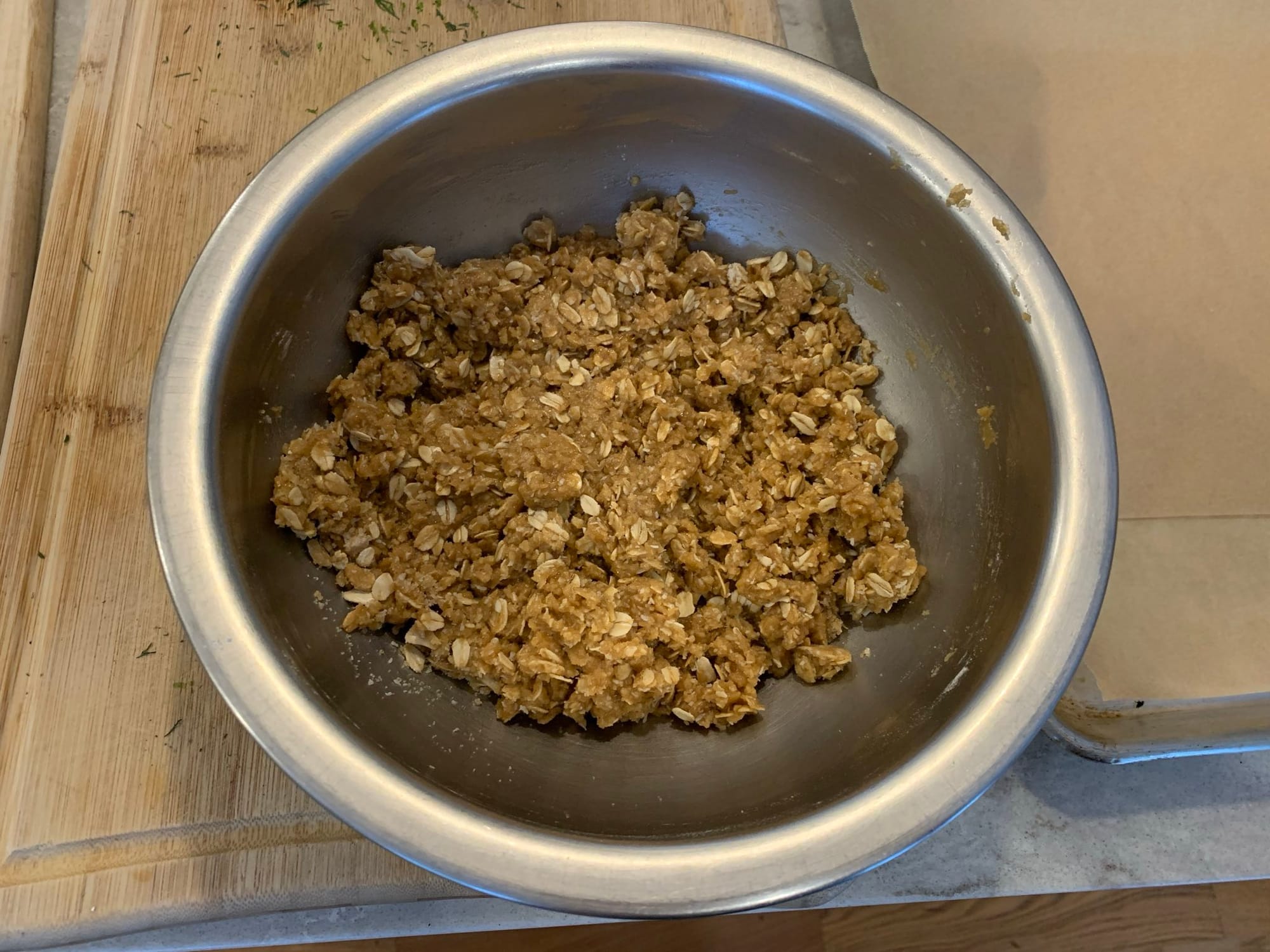 The next dish I made from the Tomb Raider Cookbook was Anzac Biscuits, a biscuit (NOT a cookie) of Australia-New Zealand origin (hence "Anzac"). Having existed since at least World War I, they contain rolled oats, shredded coconut (a modern addition), golden syrup, butter, flour and in this case, multiple kinds of sugar. The cookbook offers a substitute for golden syrup: half corn syrup and half honey.