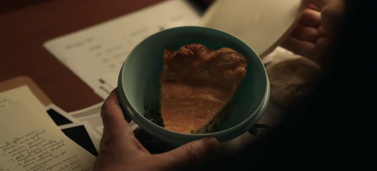 It appears toward the end of episode 4, when Elizabeth Zott is on a tear after discovering one of her daughter’s classmates has been stealing her lunches. Confronting her father, Walter Pine, a producer at the local TV station, she brings him her recipe for chicken pot pie and a sample. Walter tries the pie, and it’s what gets her the job as the host of Supper at Six, even if she isn’t interested at first.