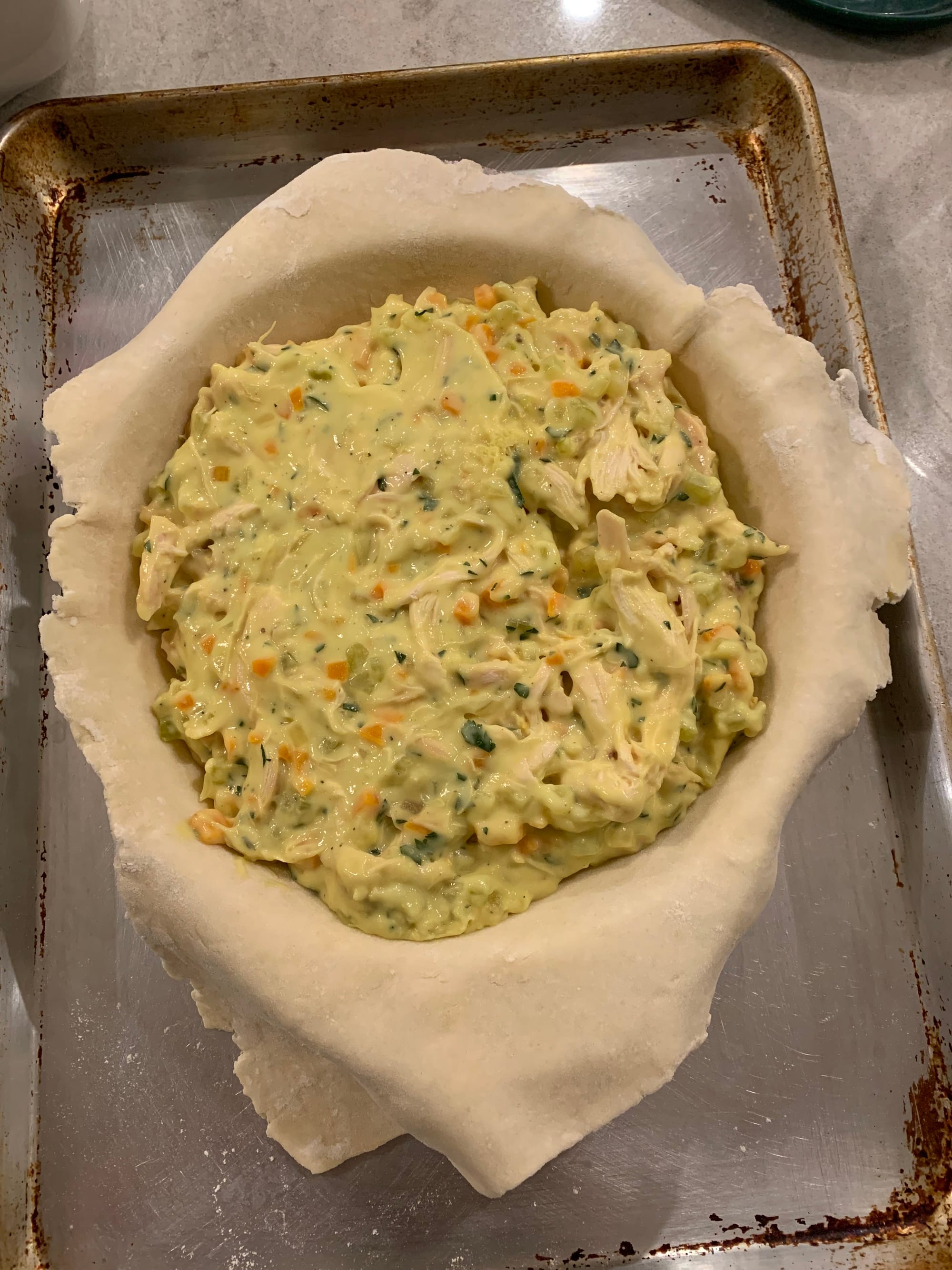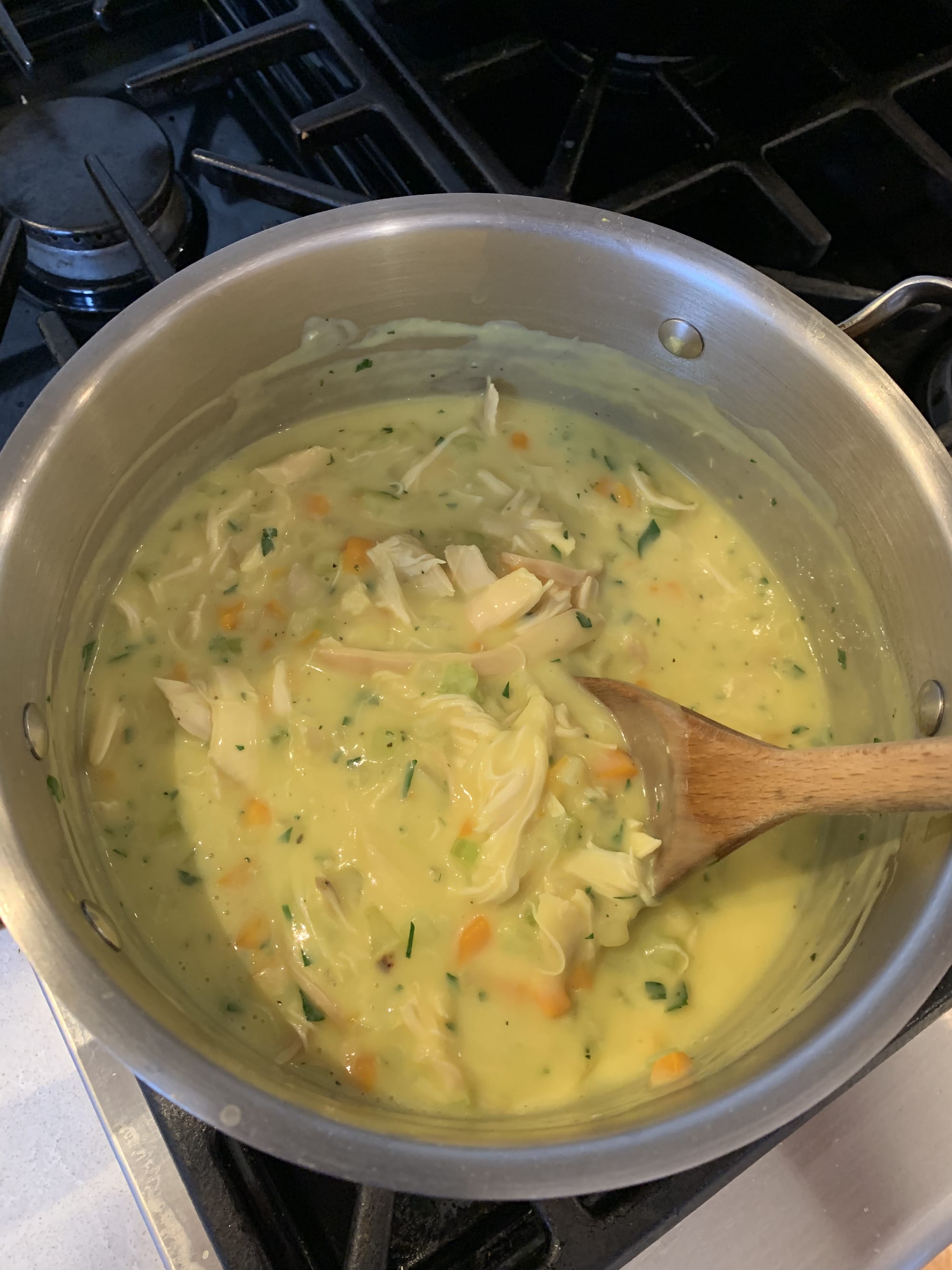 Unlike most chicken pot pie recipes, this one only has three vegetables: onions, carrots and celery, what’s known as the mirepoix. Otherwise, it’s chicken-heavy. Even better: you can buy pre-cooked chicken to make the recipe easier, and the filling is entirely make ahead. As a matter of fact, you have to chill it in the fridge before baking the pie.