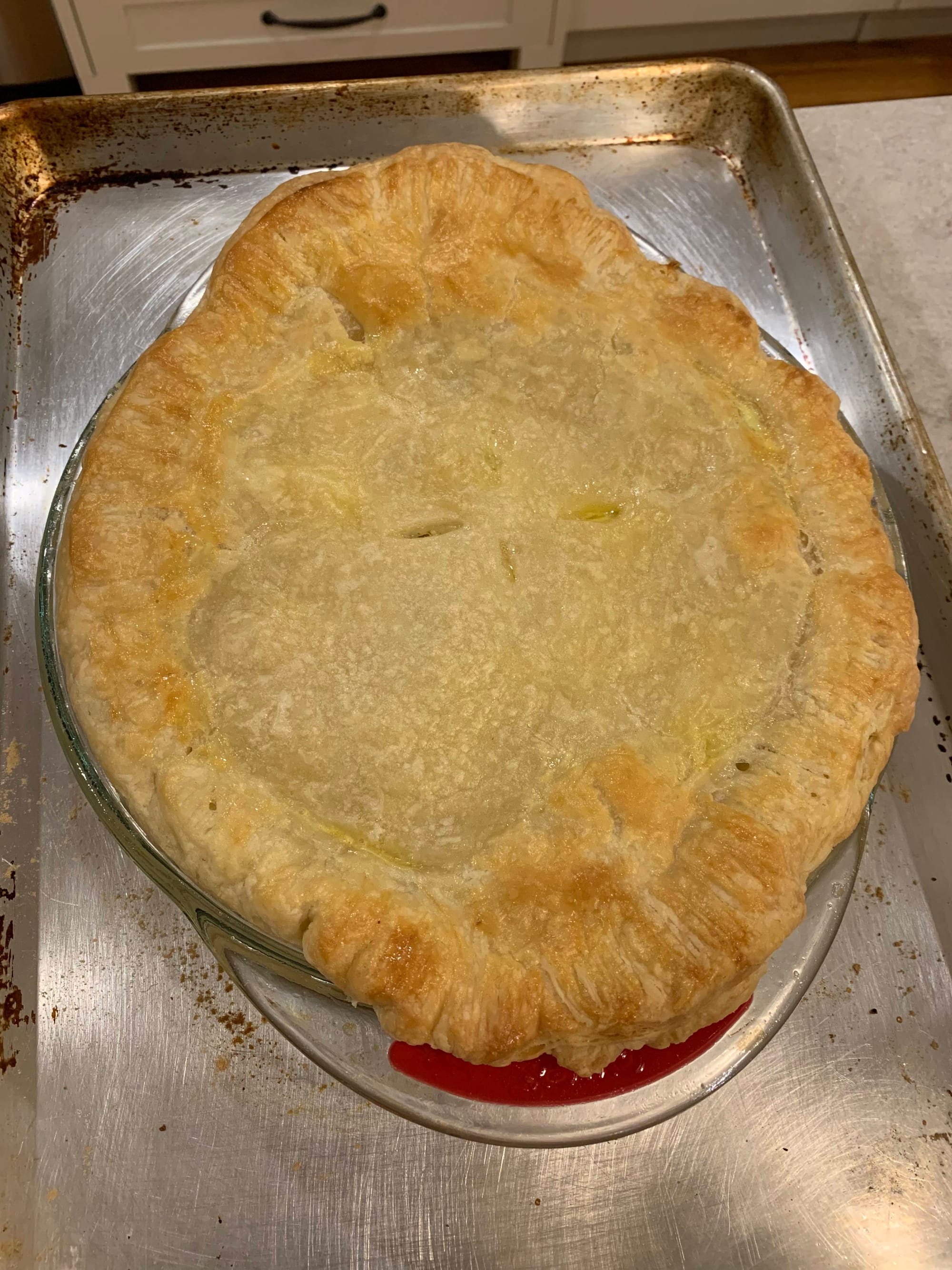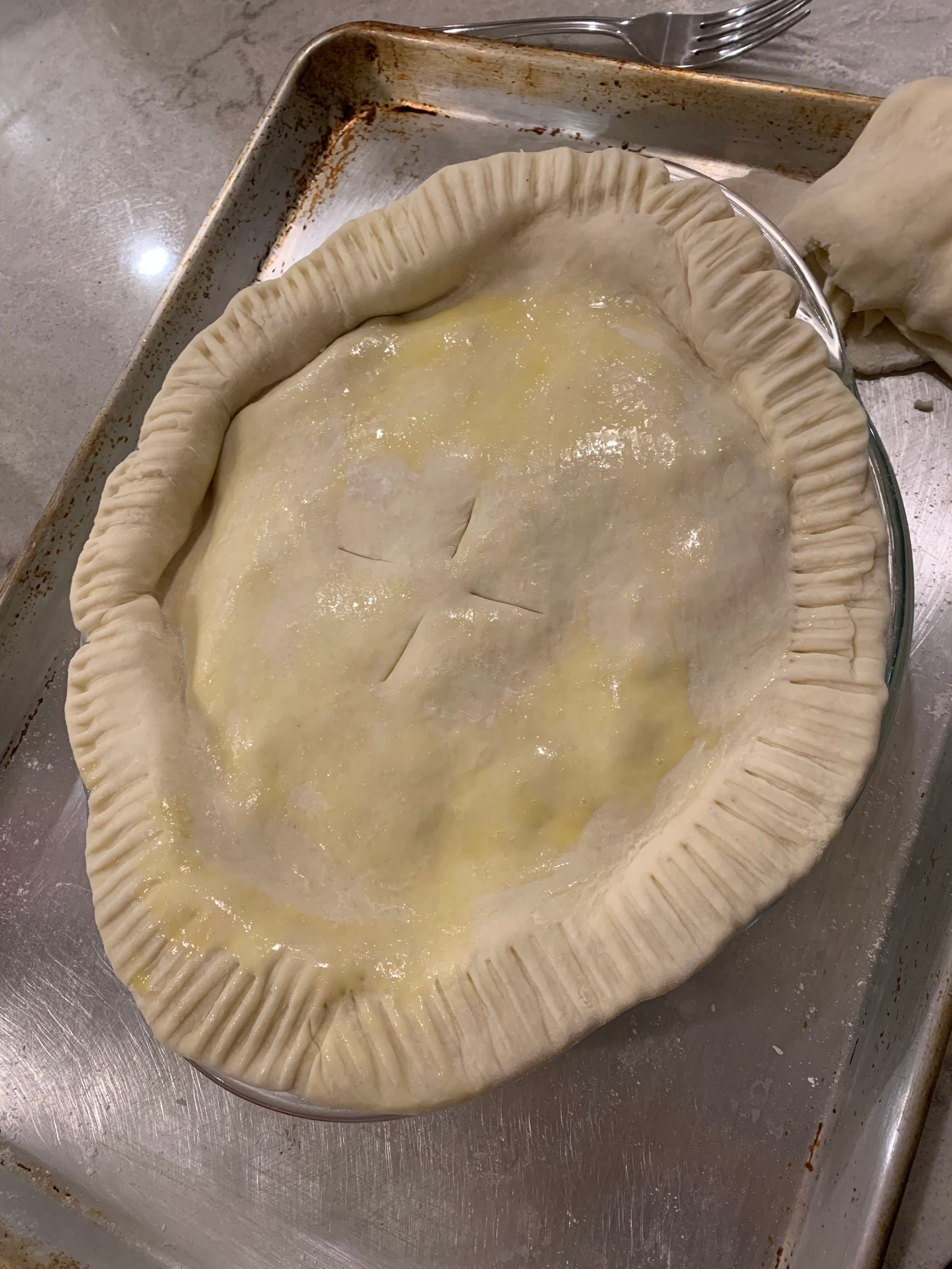 The filling has a golden color from the unique addition of turmeric, and is flavored with Italian parsley and thyme. When looking back at the episode in writing this post, I read the written recipe (the ingredients, at least) that Zott gives to Walter Pine and it mentions adding 3-4 diced potatoes. The recipe on the official site doesn’t include potatoes. Personally, I think they’re unnecessary when you already have a butter-rich crust.