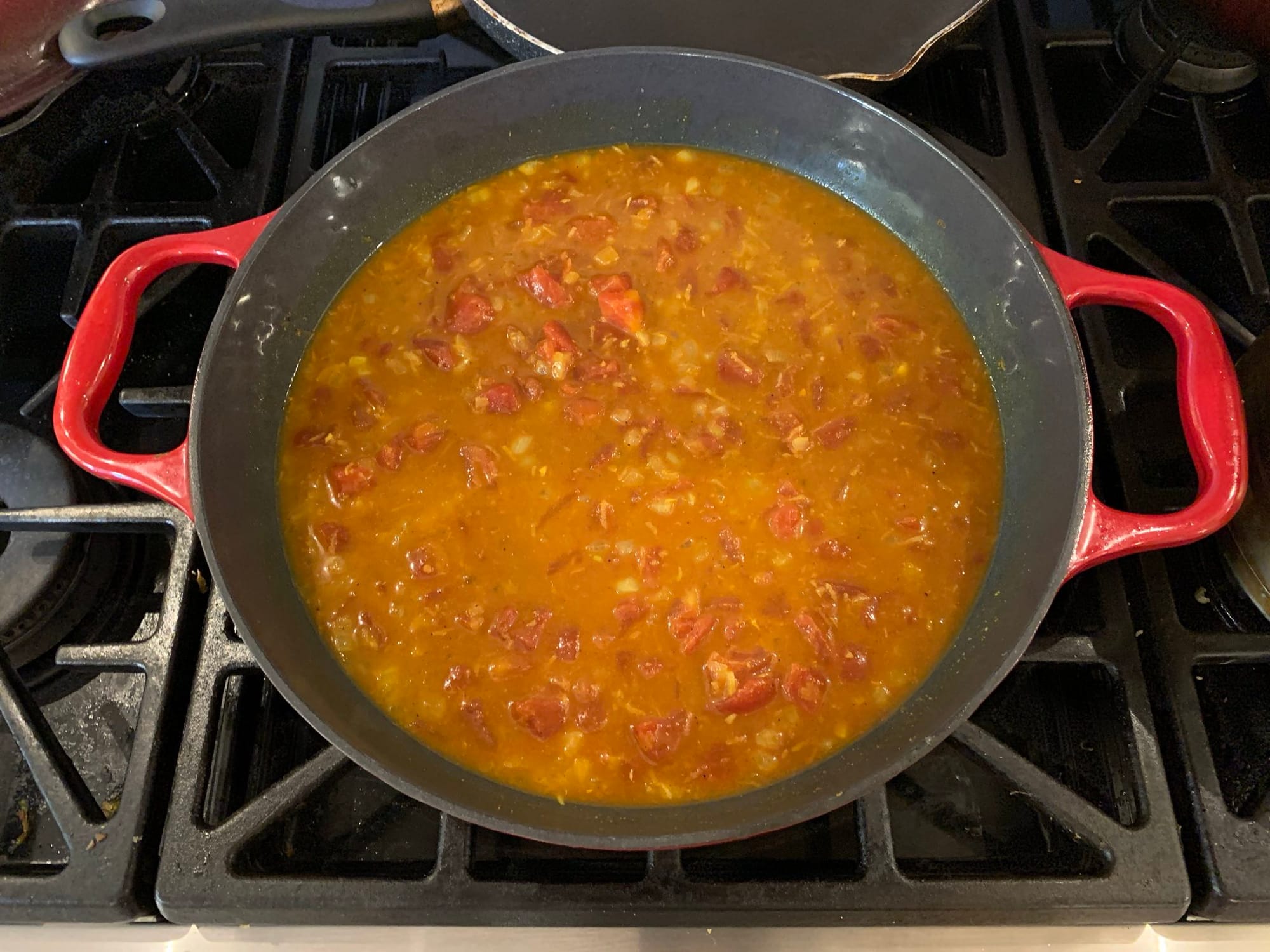 I always have to make an adjustment with certain recipes. In the book, it says to use a 14.5 oz can of diced tomatoes. Where I live, only 28 oz ones are available, so I measured out 1 3/4 cups of the tomatoes, which is roughly the equivalent. The rest went into the fridge for a later use.