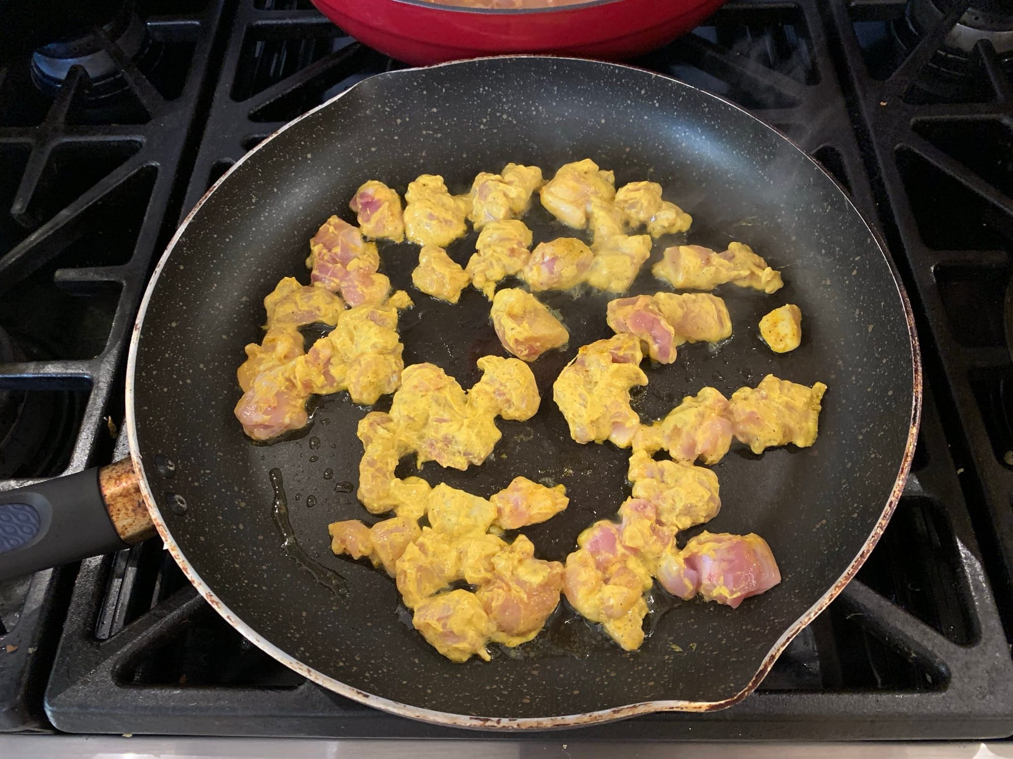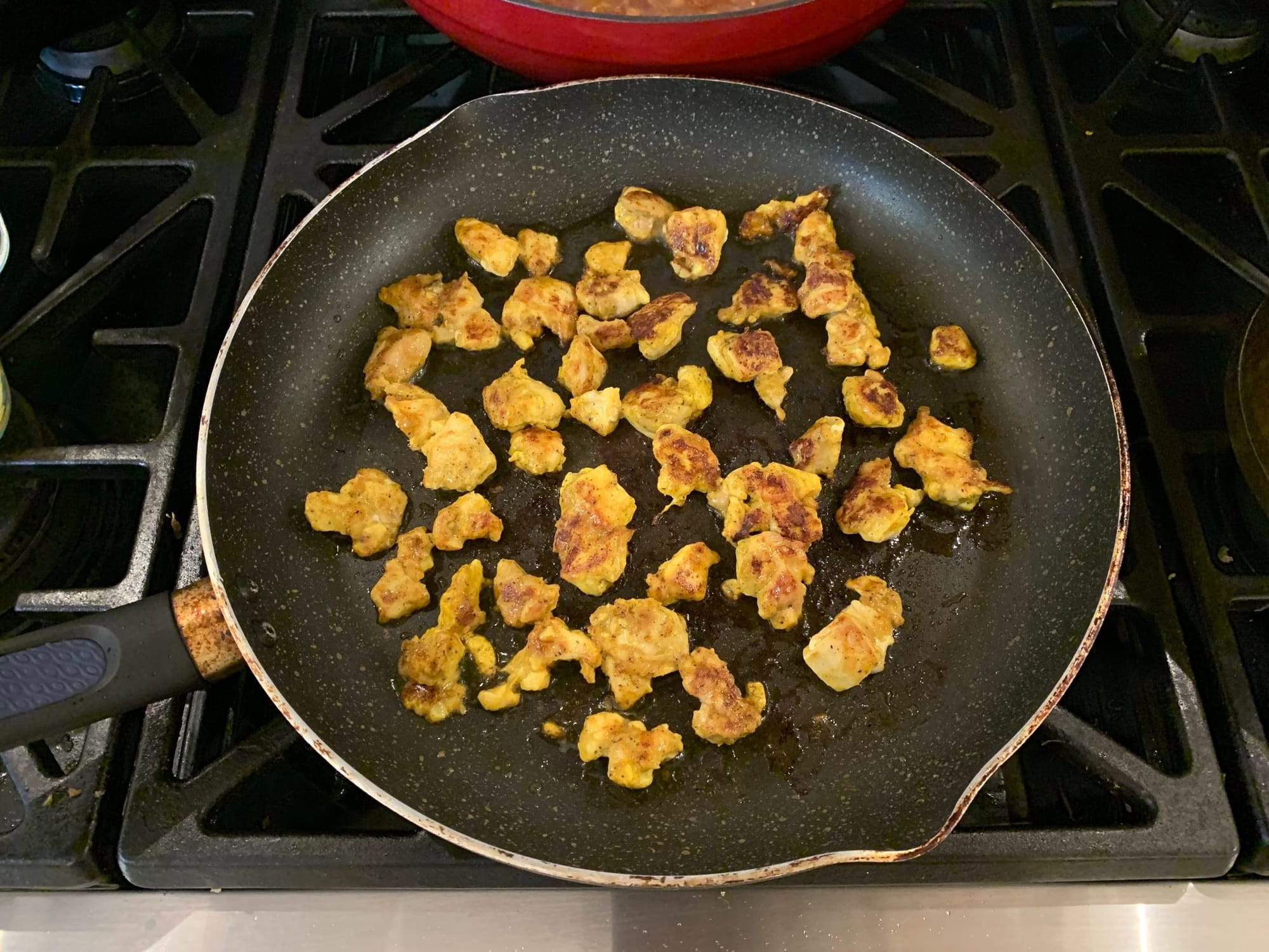 Chicken Tikka Masala is easy to cook and utterly scrumptious. I made the sauce for it first, then moved it to the back of the stove to simmer while I worked on my chicken. The cookbook doesn't say to do this, but I poured some water into the pan after to deglaze it, then poured that flavorful water into the sauce. If you've read this blog so far, you'll likely know that I dislike canned diced tomatoes, but they get pureed for this recipe, so I had no issue using them.