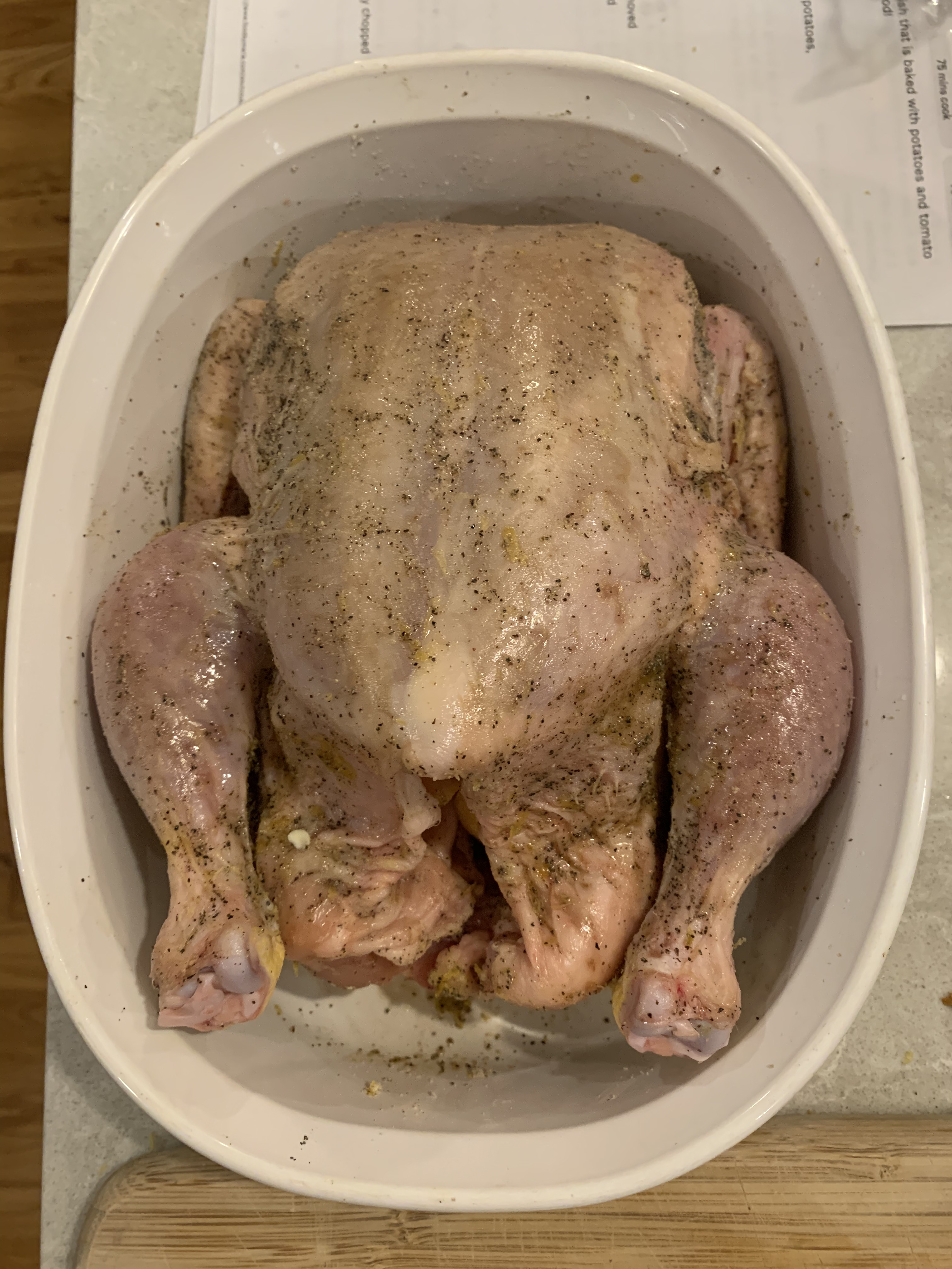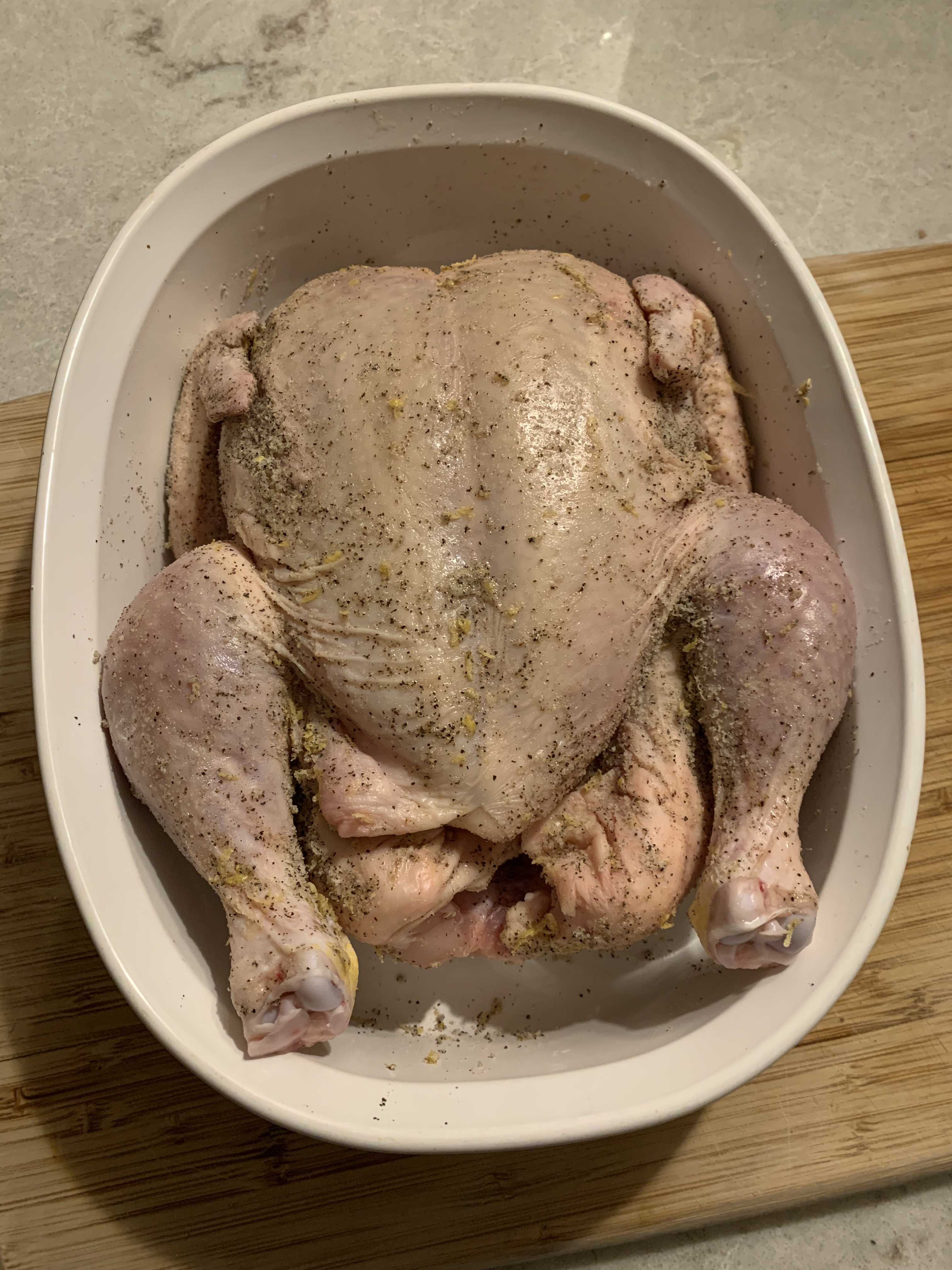What makes this roast chicken unique is the dry rub ingredients for it. It uses both lemon zest (along with lemon quarters and butter inside the cavity), and baking powder. I wasn’t sure what the latter ingredient accomplished; it’s not a pastry, so there’s no rising in the oven. According to this article from Allrecipes, it helps to achieve a crisp skin. I’m all about that. With my question answered, I got to work.