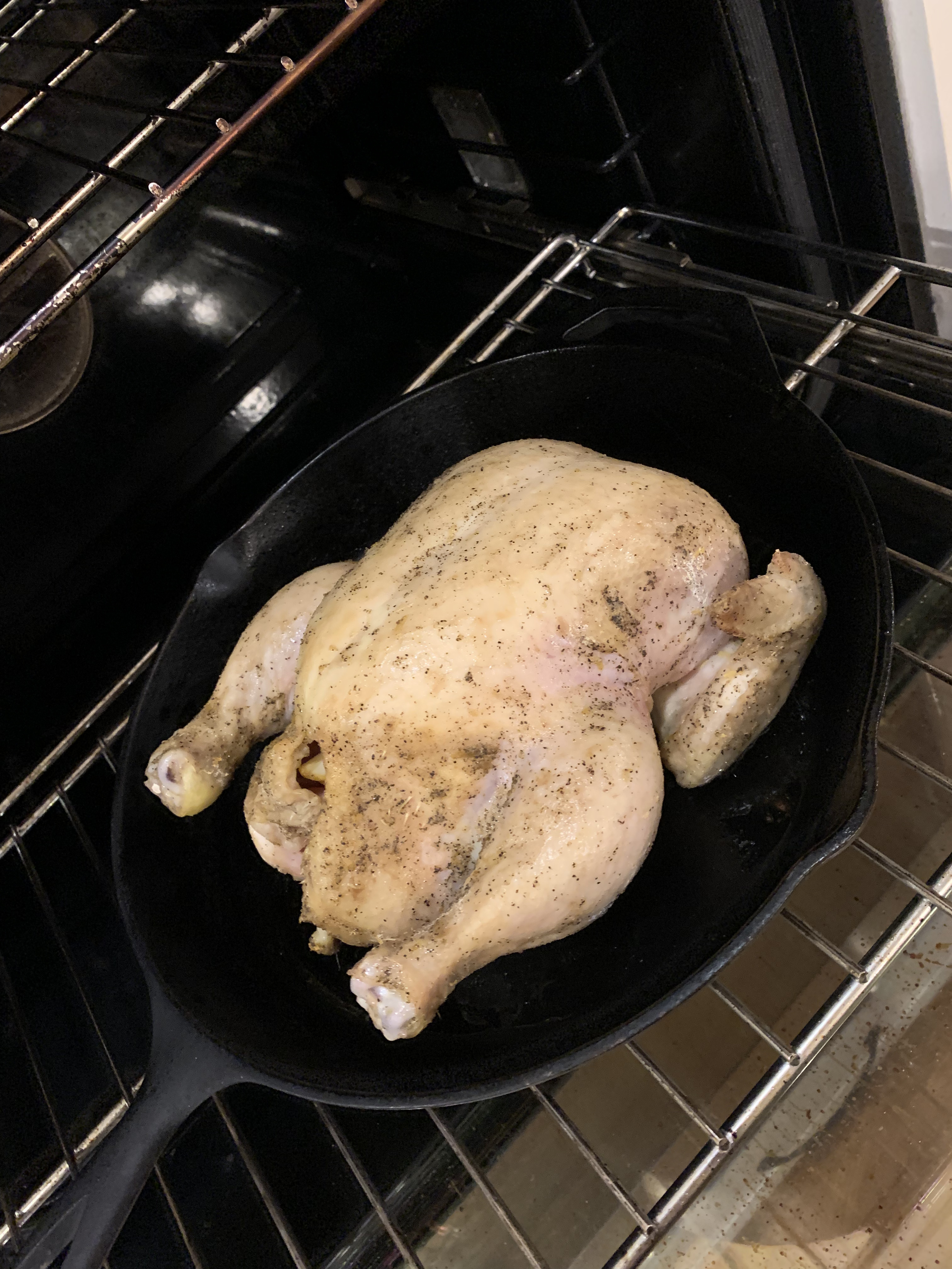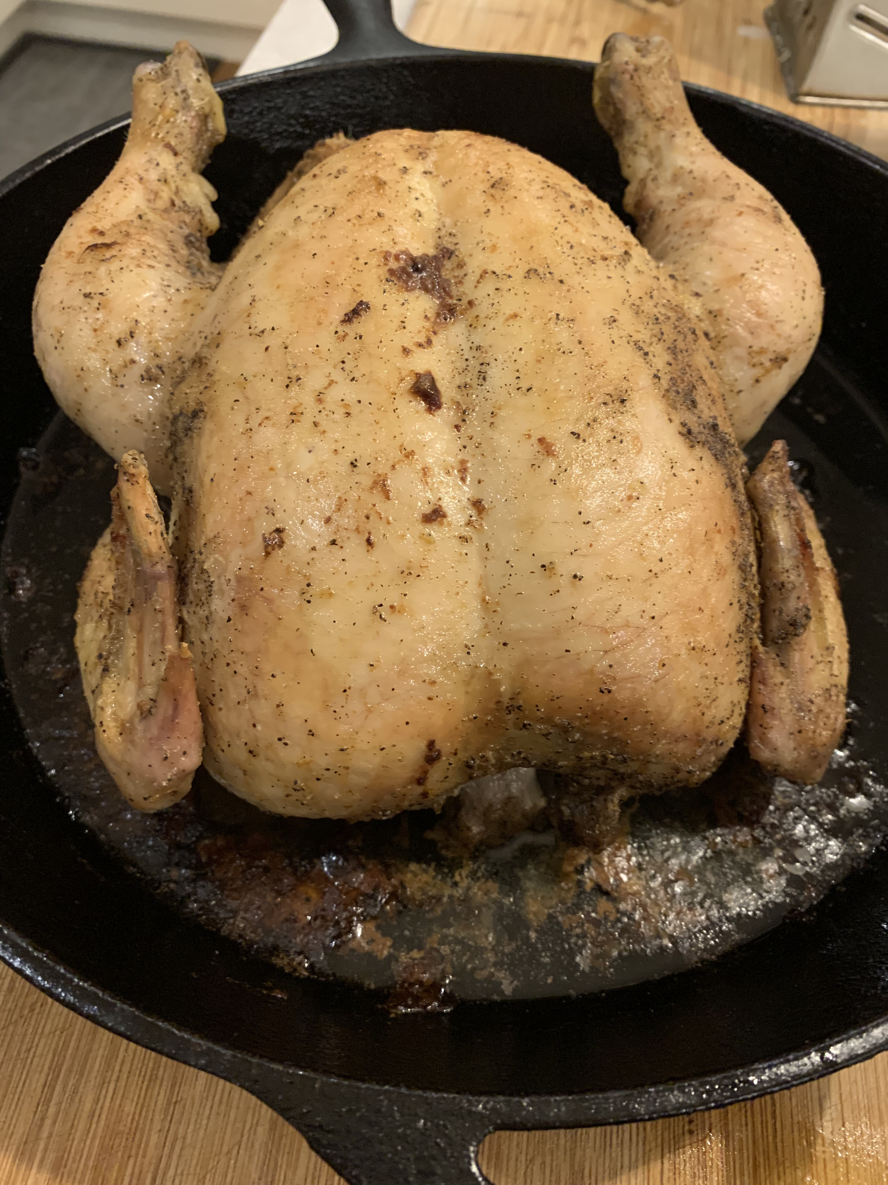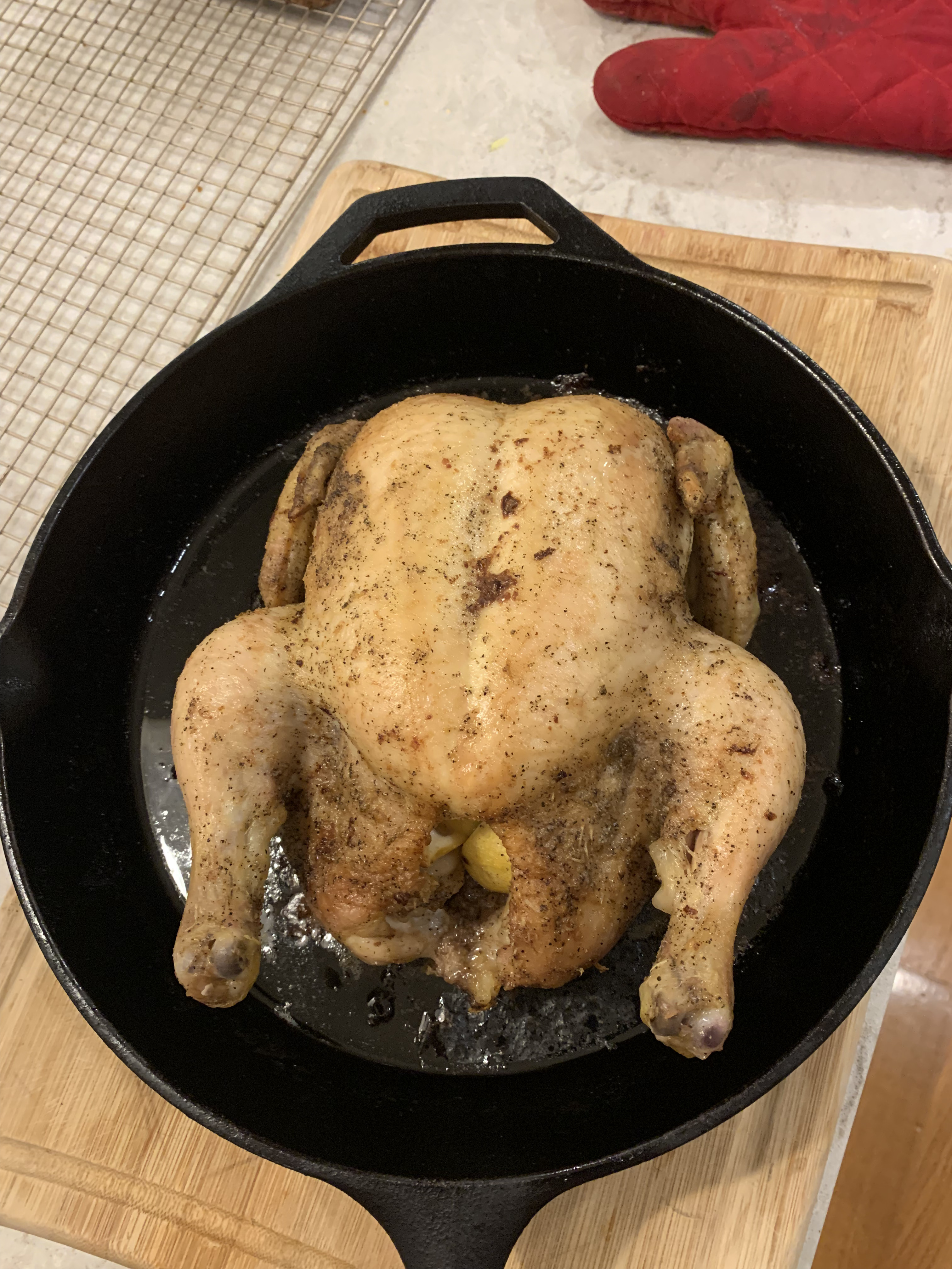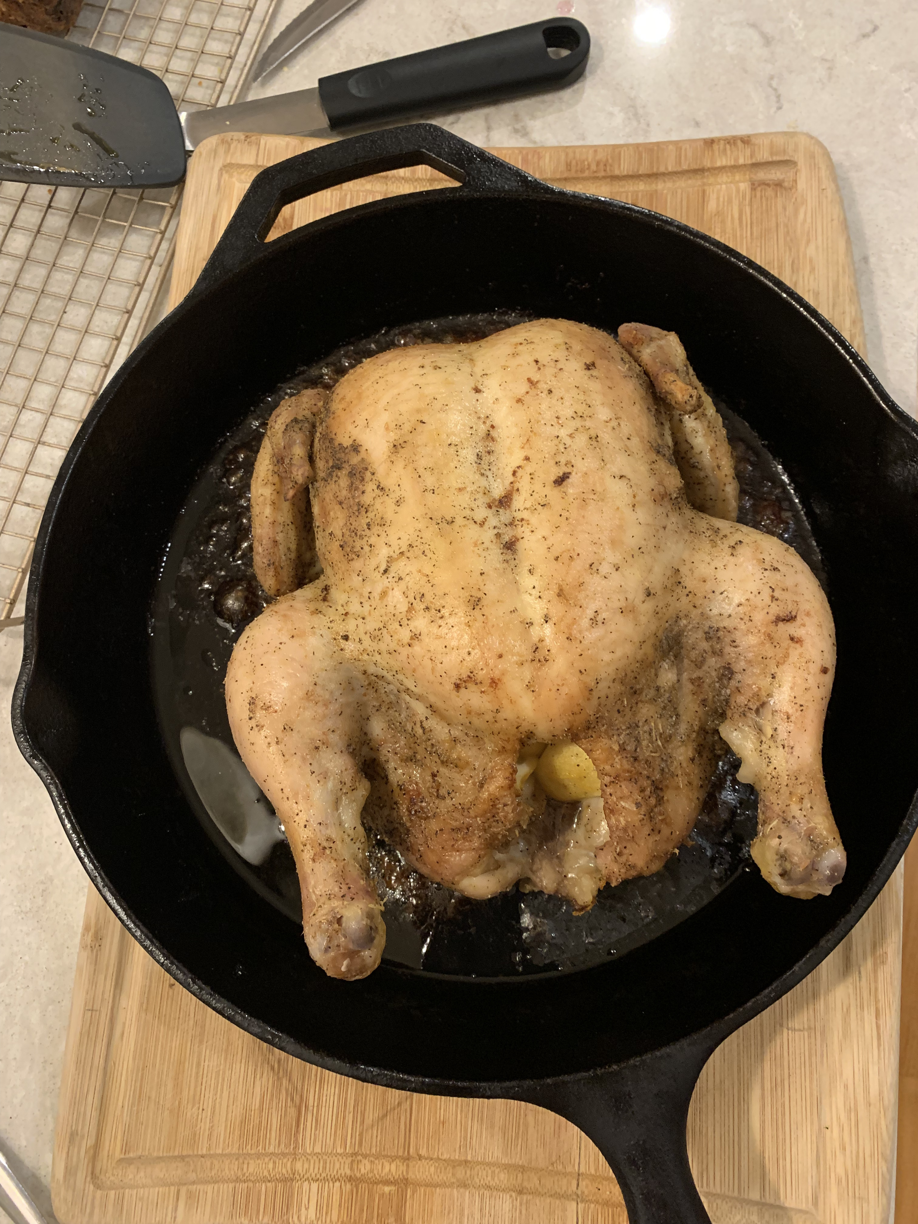 The second step to achieving a very crispy exterior is preheating a cast iron skillet along with your oven. The third is to coat the chicken skin in olive oil. To achieve a juicy chicken, a half stick of butter is stuffed inside, which will mix with the natural juices the bird releases as it cooks. Then it’s a case of basting in 15 minute intervals until the chicken is fully cooked. The written recipe says it’s done when you insert a thermometer into the thigh meat and it reads 155°F. Since it has to rest for 15 minutes after, there’s plenty of time so the carryover cooking will finish it.
