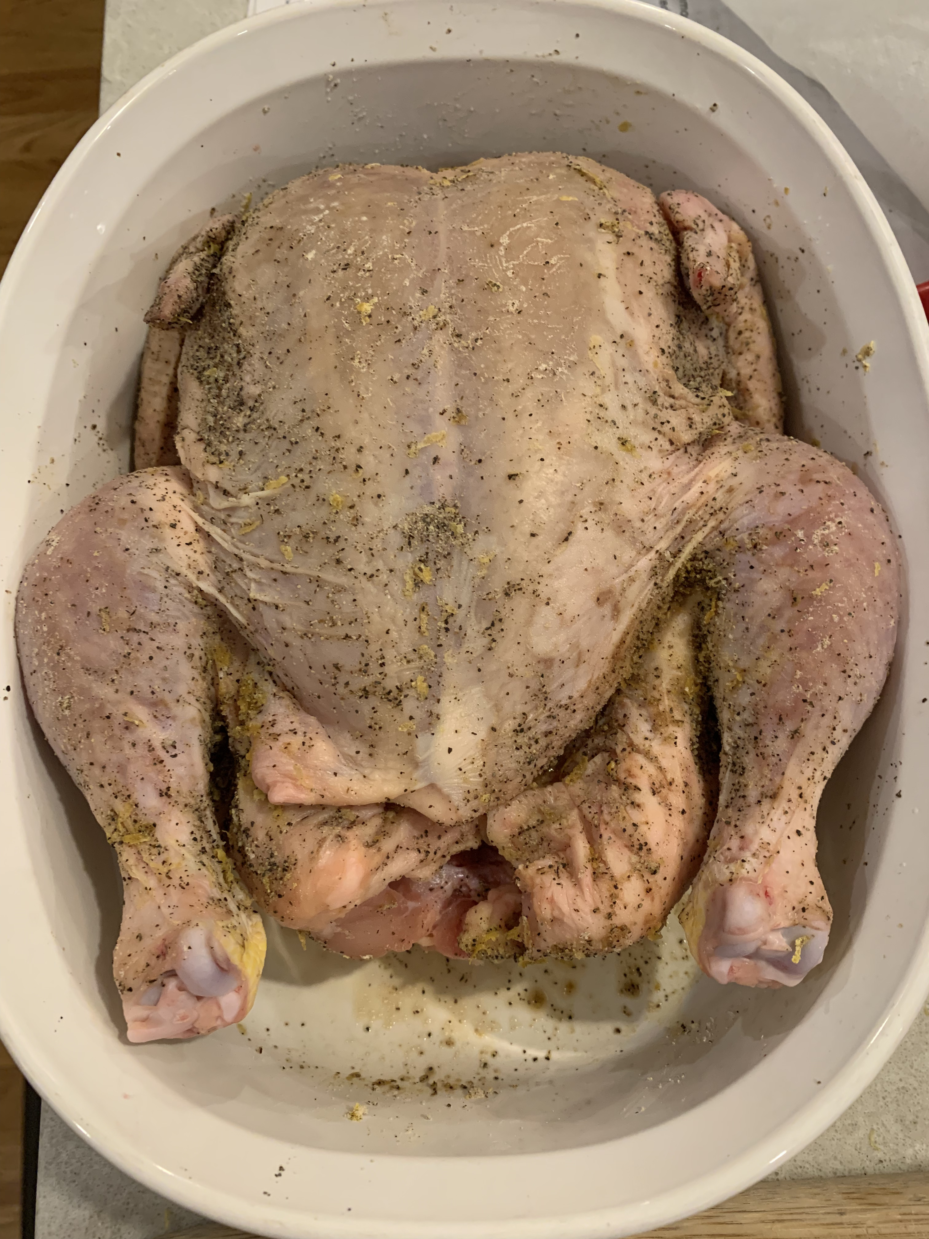 The aforementioned dry rub is put onto the chicken the night before so it can tenderize the skin in your fridge overnight, uncovered. Important: do not have it near cooked meat in your fridge due to cross contamination. I have a second fridge, and I ensured there was nothing else in it before I put the chicken in there.