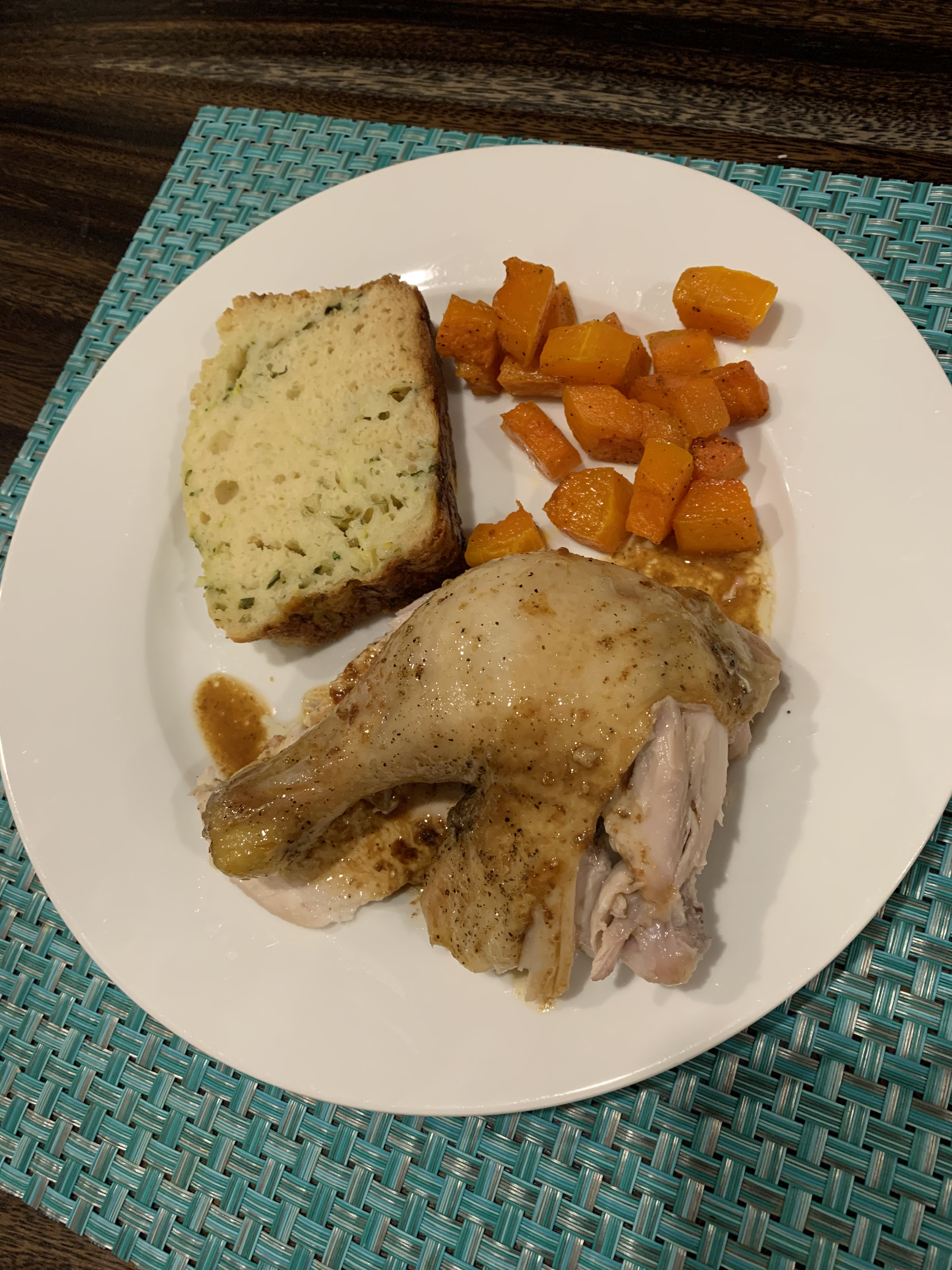 This roast chicken was life-changing. Juicy, incredibly flavorful, and the skin! Oh the skin! I always eat the skin off a store bought rotisserie chicken before I even get to the meat, that’s how weak I am for chicken skin. This one was 10x better. Very succulent and moist. As you’ll see in the gallery below, I served it with roasted butternut squash and cheddar chive zucchini bread.