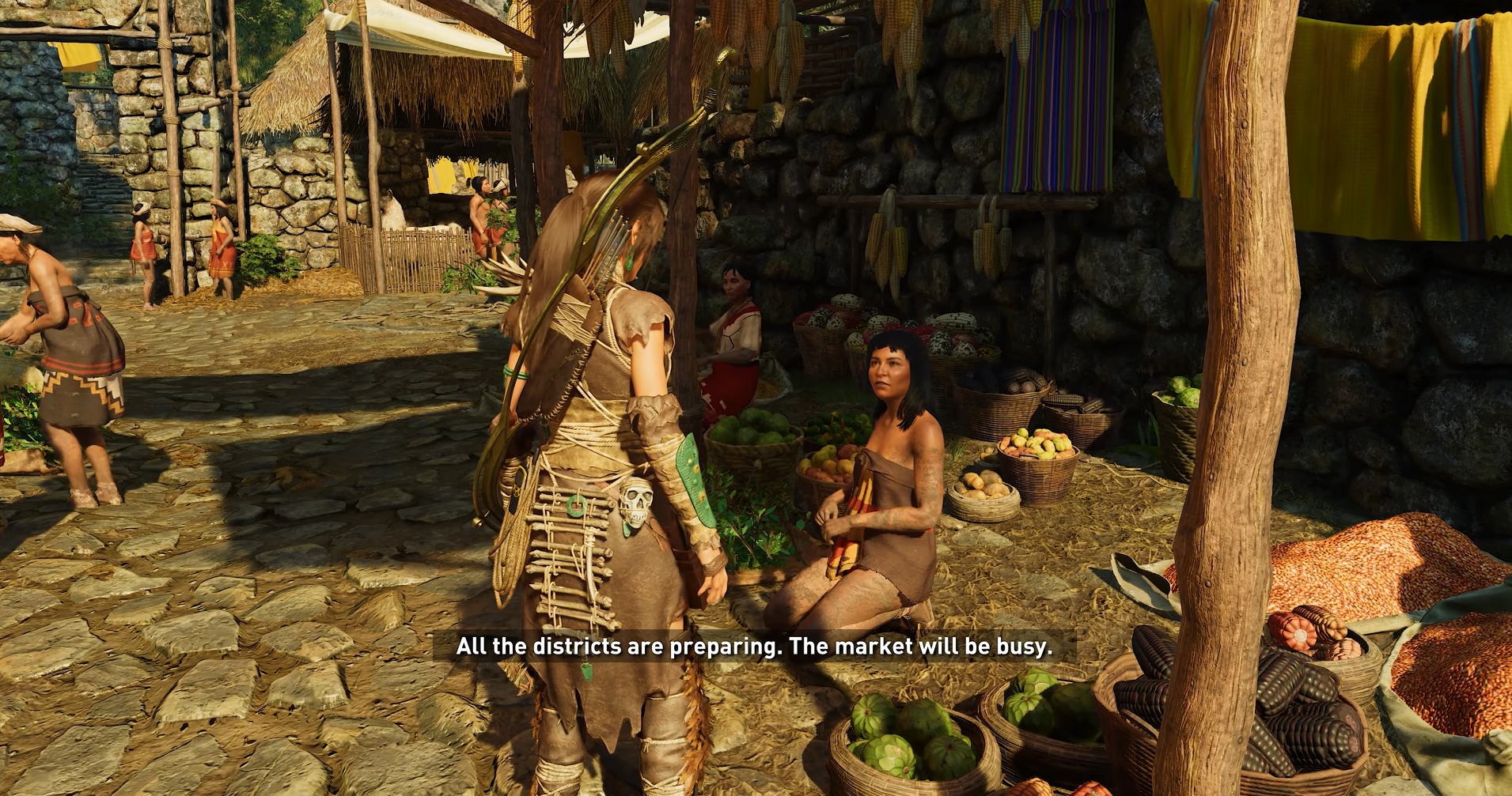 Corn is an important part of the culture of Paititi, the hidden (Peruvian) city Lara explores in Shadow of the Tomb Raider. A minor character, Hedia, works in the corn fields, and one of the relics Lara can collect is an urpu, a ceremonial ceramic jar that stores chicha, or corn beer. Another relic, the metatl, has corn legs. One of the murals in the Porvenir Oil Fields pays tribute to Mama Zara, the Inca goddess of grain, whose name means “maize mother”. The mural text mentions that farmers would dress maize plants like a doll in her honor, and hang maize dolls from willow trees for her. Finally, multicolored ears of corn can be seen in baskets in the market, but alas, Lara can’t buy or eat them.