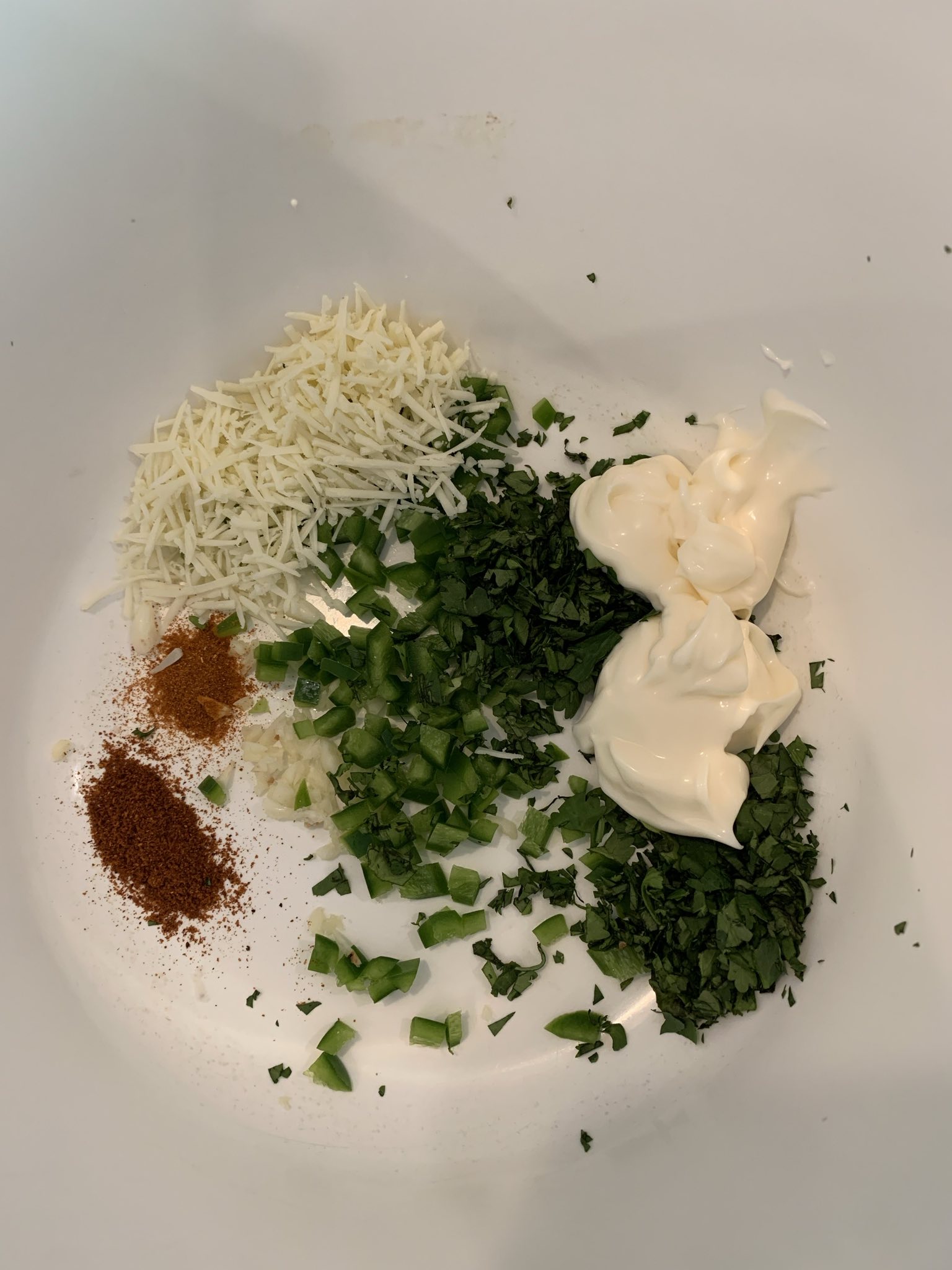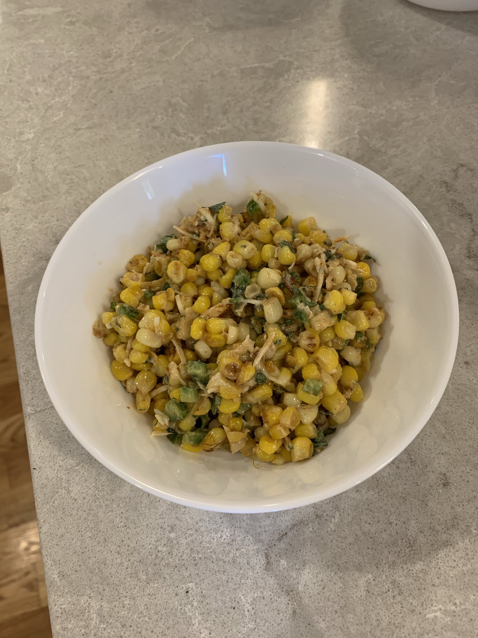 The preparation for Esquites is quite simple: cut the kernels off the cobs and cook them in a pan with salted butter until as much of them are charred as possible. Let them cool a bit, and then mix them with your other ingredients. This recipe includes a raw clove of garlic and a raw jalapeno pepper (deseeded, which I normally do anyway); I wasn’t sure about this at first, but they’re mellowed enough by the residual heat and other ingredients that they don’t need to be cooked with the corn. It was quite nice!