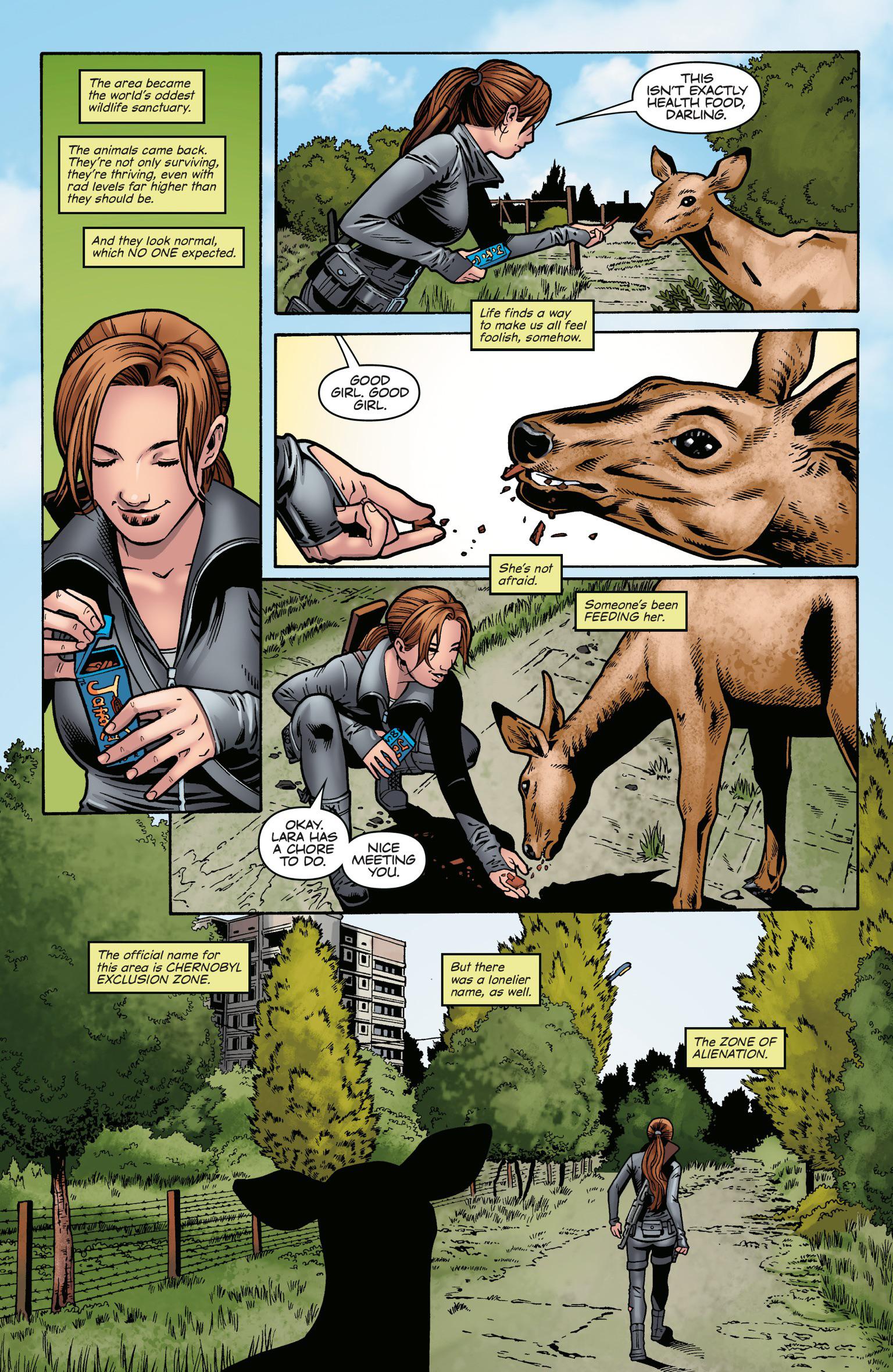 At one point in the story, Lara travels to Chernobyl to rescue someone and feeds Jaffa Cakes to a deer, who then begins to follow her. Jaffa Cakes make appearances in issues 4, 5 and 12, and are mentioned in a note from Lara’s butler Winston, which is a relic in the Blood Ties DLC for Rise of the Tomb Raider. The writer of 2013 and Rise, Rhianna Pratchett, said that a mention of them in the 2013 game was cut, but she told the comics’ author Gail Simone about it, and Gail incorporated them into the comics. Rhianna also gave Gail a welcome package with Jaffa Cakes, Irn Bru and other British delicacies; alas, the Jaffa Cakes weren’t a hit.