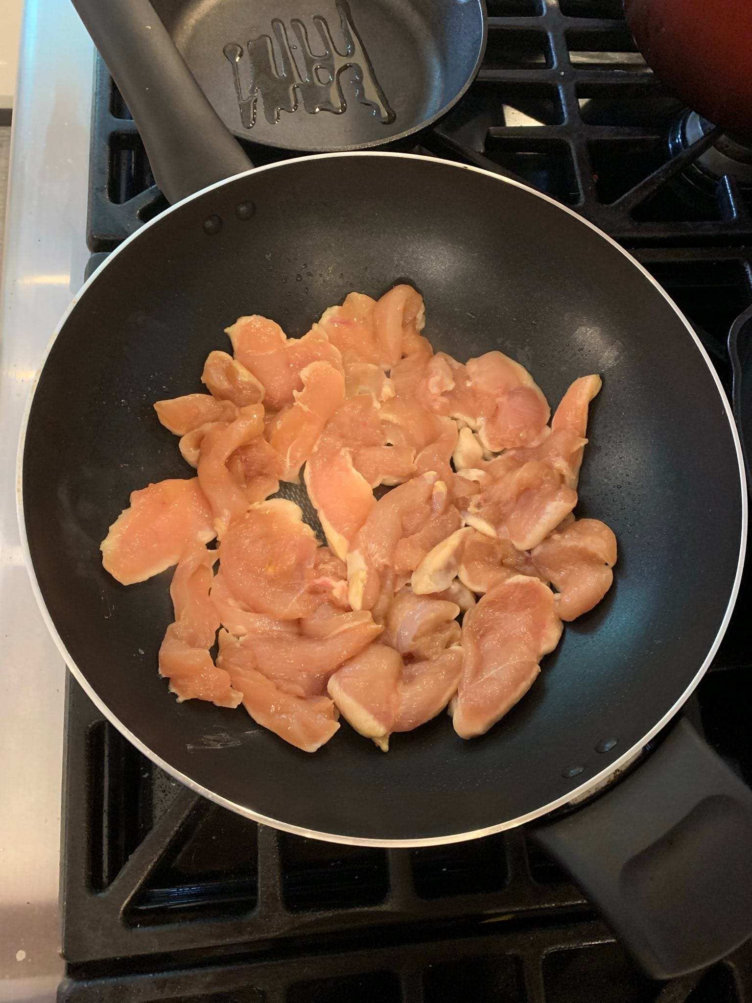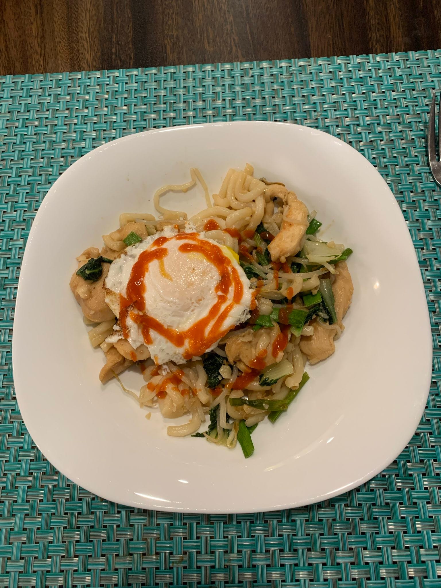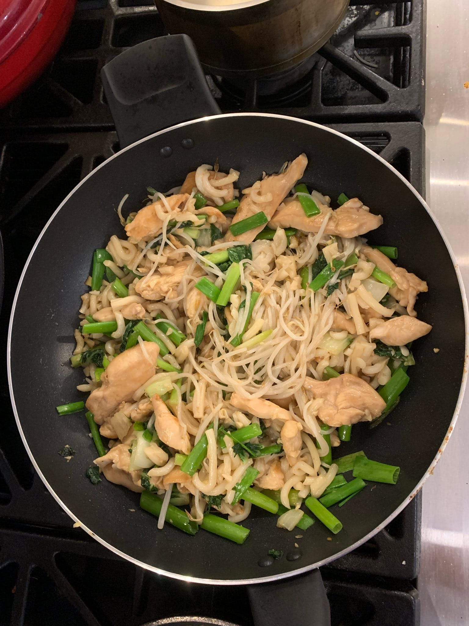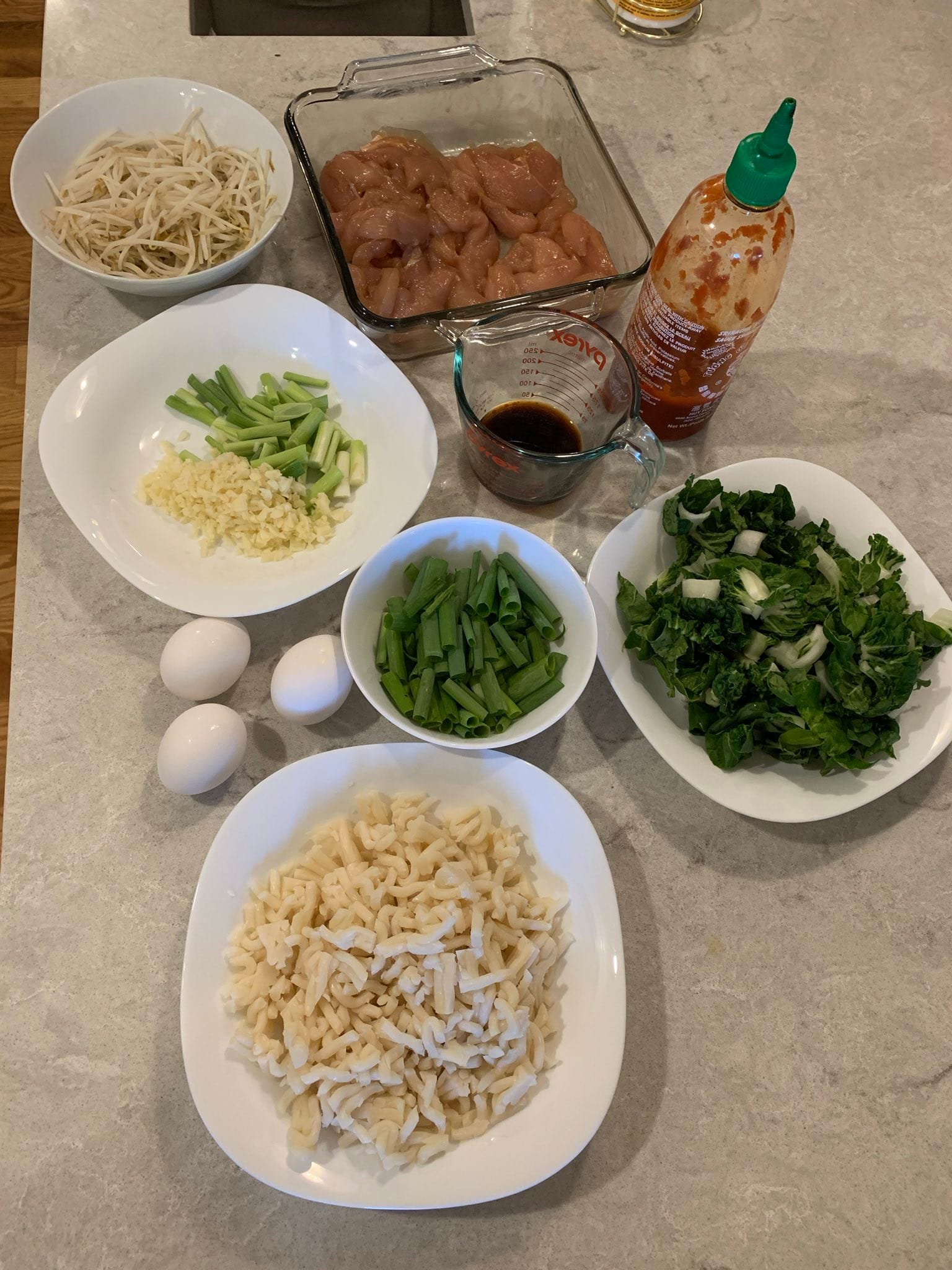 This isn't much different from most stir fries in terms of prep. You cook everything in stages: the marinated chicken breast until it's seared and fully cooked, then take that out, add your vegetables in stages, then the noodles, chicken and sauce, and cook that until everything is heated through. The whole point of a stir fry is that nothing overcooks, and at the end, you finish with bean sprouts and scallion greens, plus a fried egg and chili sauce (I used sriracha) to your liking.