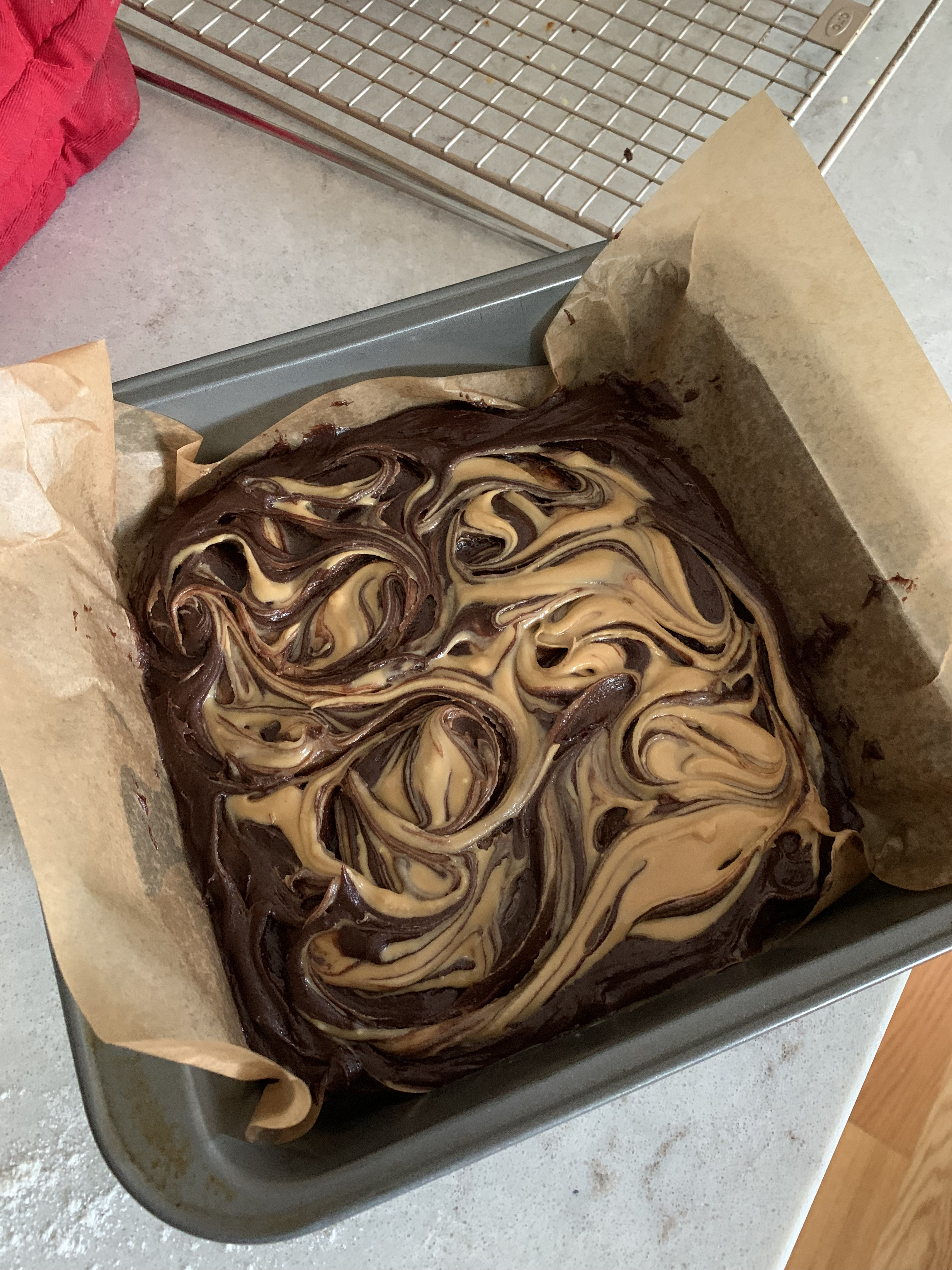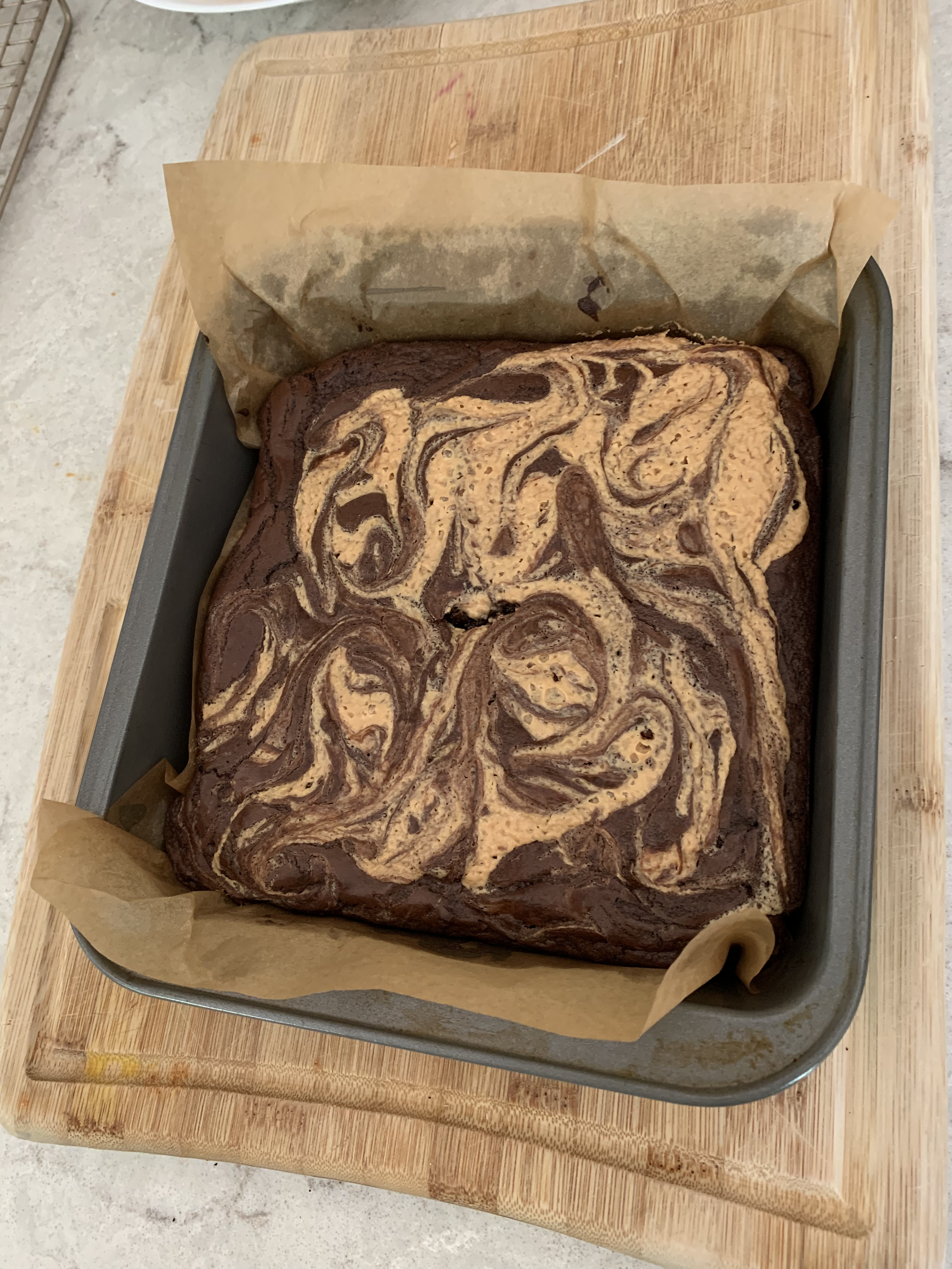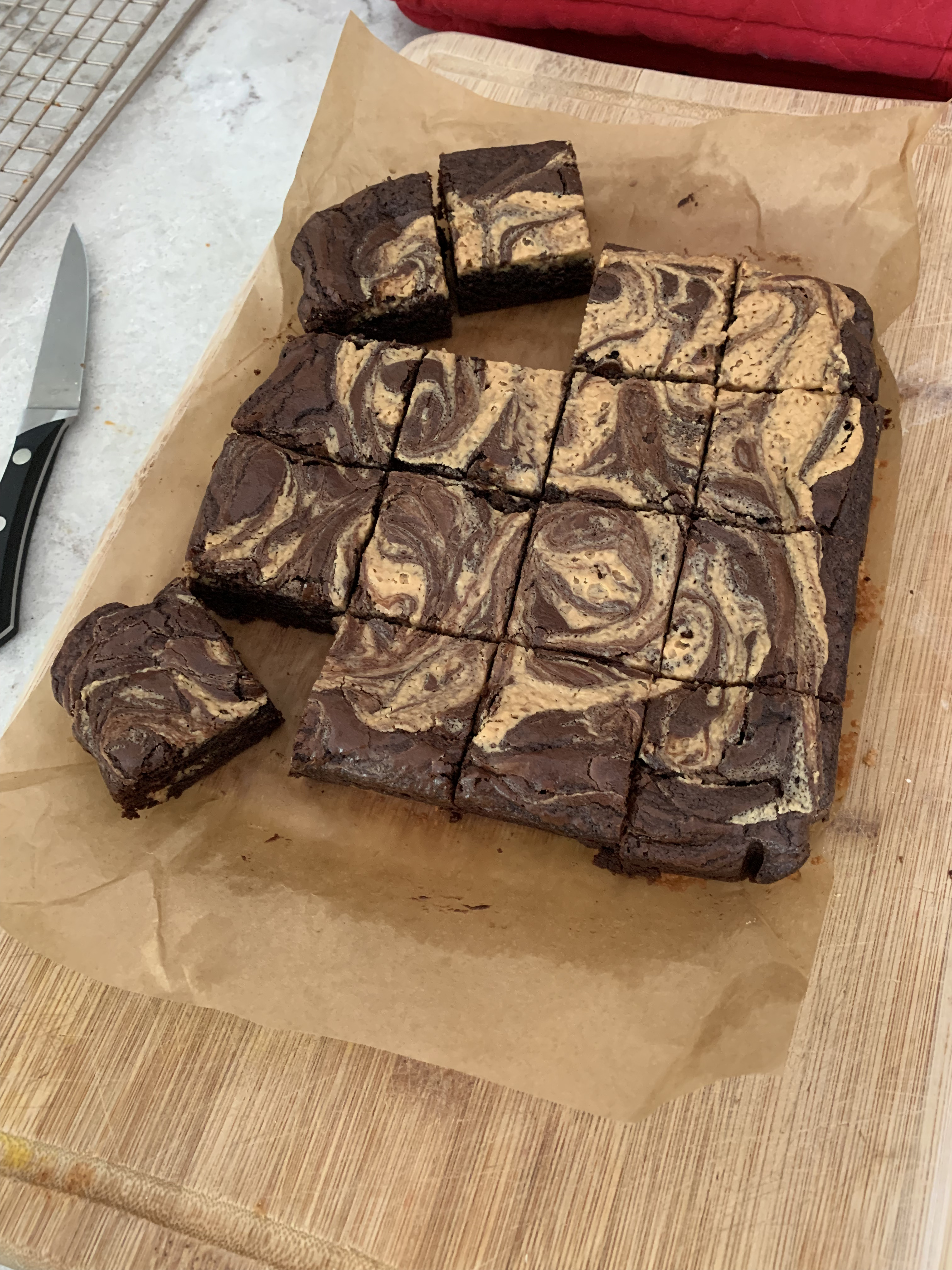 There isn’t much to say with these really. The brownies are of the fudgy kind with peanut butter swirled into the top of them before they’re baked. Anybody can bake brownies, and these were certainly as simple as every other brownie I’ve made. The fun part is swirling the peanut butter into the top, because it comes out looking very beautiful, and you can make it look however you want. They were amazing.