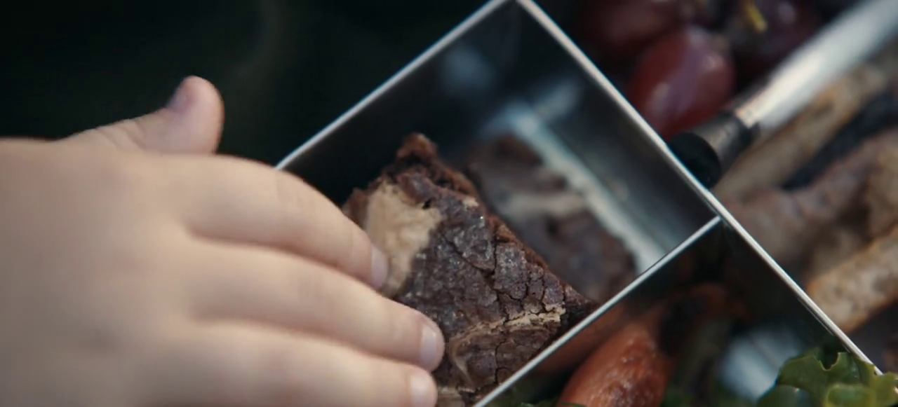 The rest of Mad’s lunch includes what looks like a roast beef sandwich, roasted carrots, lettuce and grapes. The show is set in the 50s. When I was coming up in school, brownies like this wouldn’t have been allowed. I had multiple classmates with severe peanut allergies, and nut products were banned from lunches as a result. Therefore, I would only have been able to enjoy something like this at home.