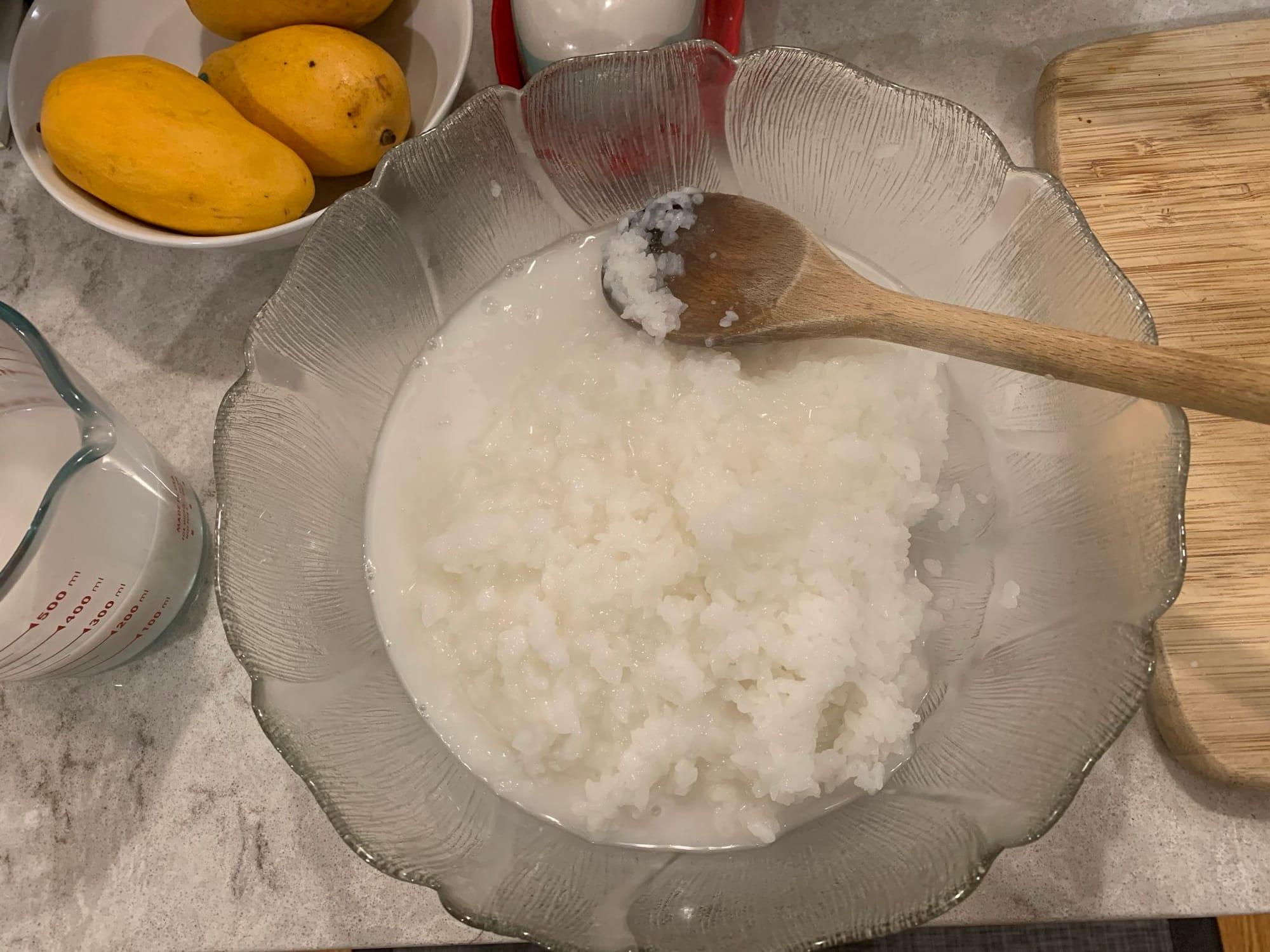 I've made versions of rice pudding before, but never Thai Mango Sticky Rice. I was excited to have this once I got my hands on some fresh, sweet mangoes and glutinous rice, which you need for this dish. First, you have to soak the rice multiple times. If I'm making risotto or any other rice dish that needs to be creamy, I never bother rinsing. Here, you do have to so it still holds its shape somewhat. I rinsed and soaked it several times until the water was mostly clear, but you'll never truly get all of the starch out.