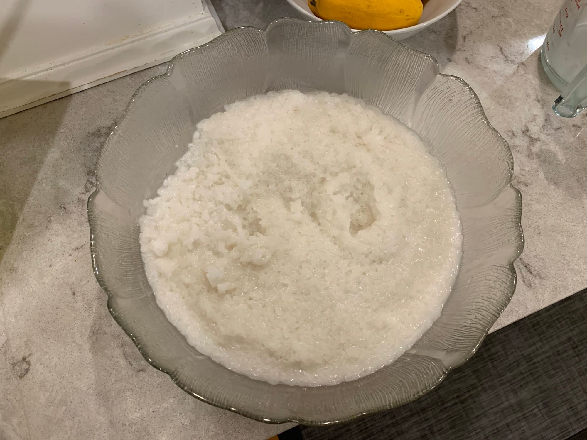 I did that in the early afternoon, and then after dinner the same day I was ready to cook the rice. As I said, I boiled it until it was tender, and then melted sugar and salt into coconut milk before stirring that in with the rice and letting it stand for a while. You're supposed to use 1 1/2 cups of the coconut mixture in the rice and keep some back to drizzle, except that was most of the mixture. I had maybe a tablespoon left to drizzle over, and a lot more rice to eat afterwards.