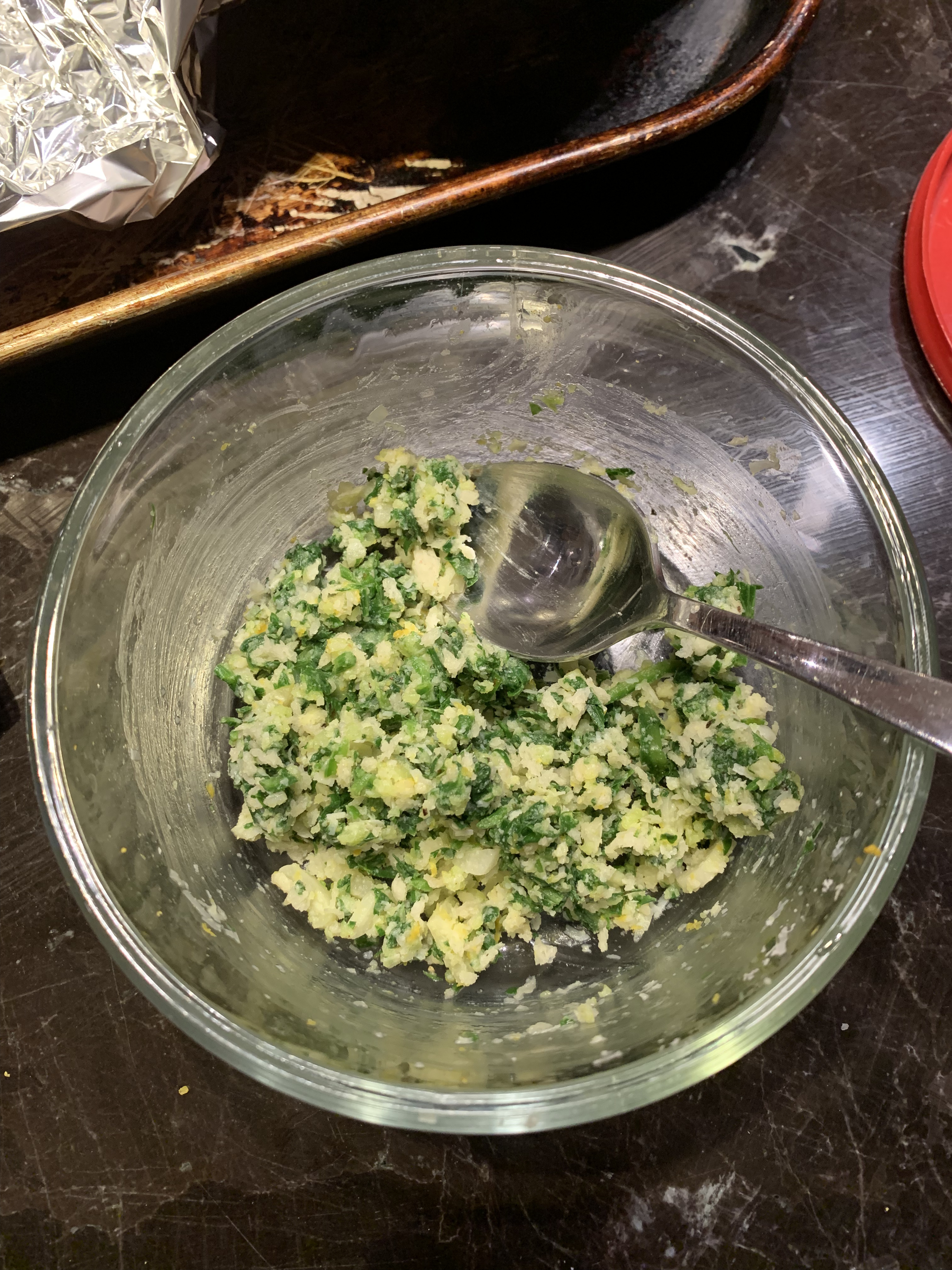 Said topping includes a clove of garlic, chopped spinach and Italian parsley (always flat leaf, never curly), salt, pepper, Parmigiano-Reggiano, and lemon juice, with more lemon and hot sauce for serving. Notably, the recipe says to use panko breadcrumbs, and in the show that's what Zott used as well, but in the Cast Chemistry in the Kitchen video, Courtney McBroom used oyster crackers. Where I come from, those are not readily accessible, so it makes sense why the recipe said to use panko. Use whichever you’ve got wherever you are.