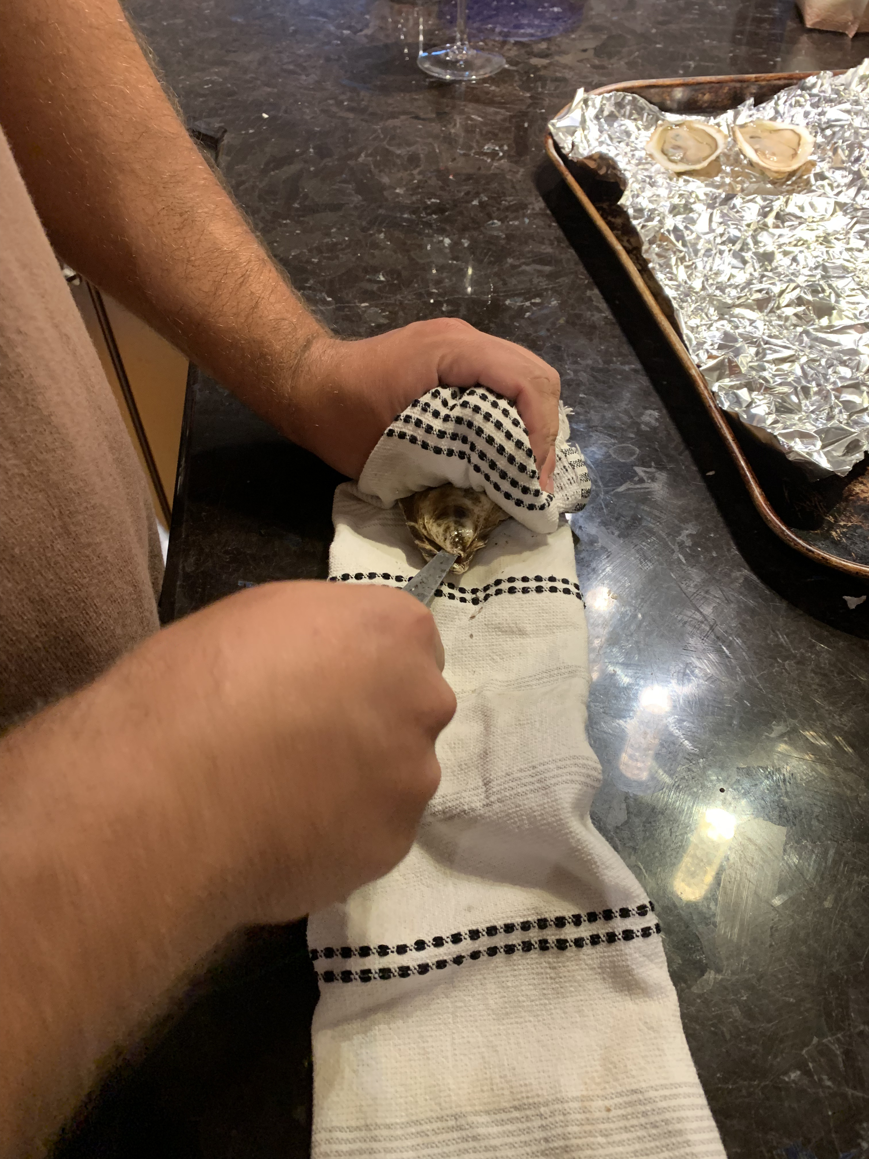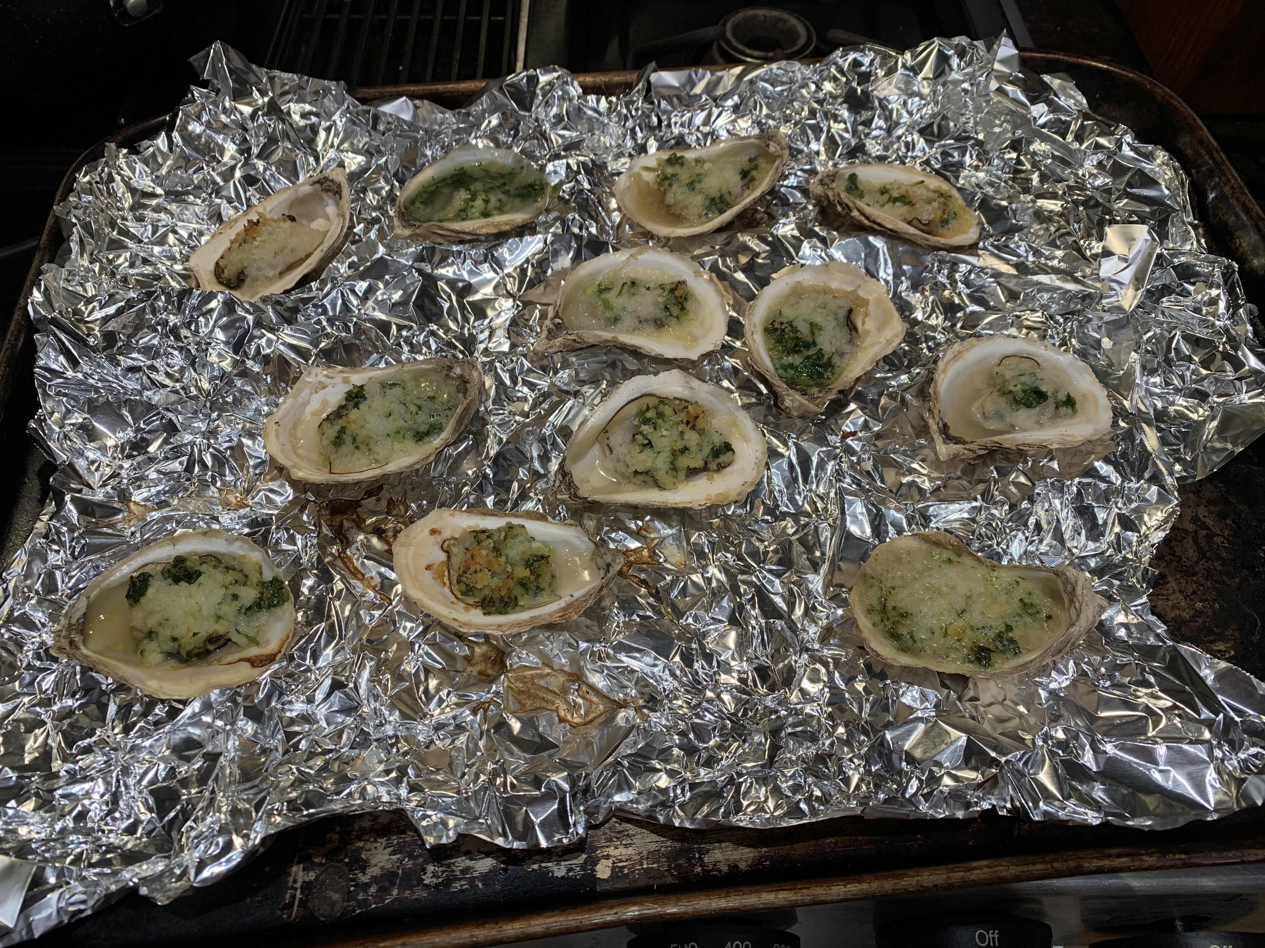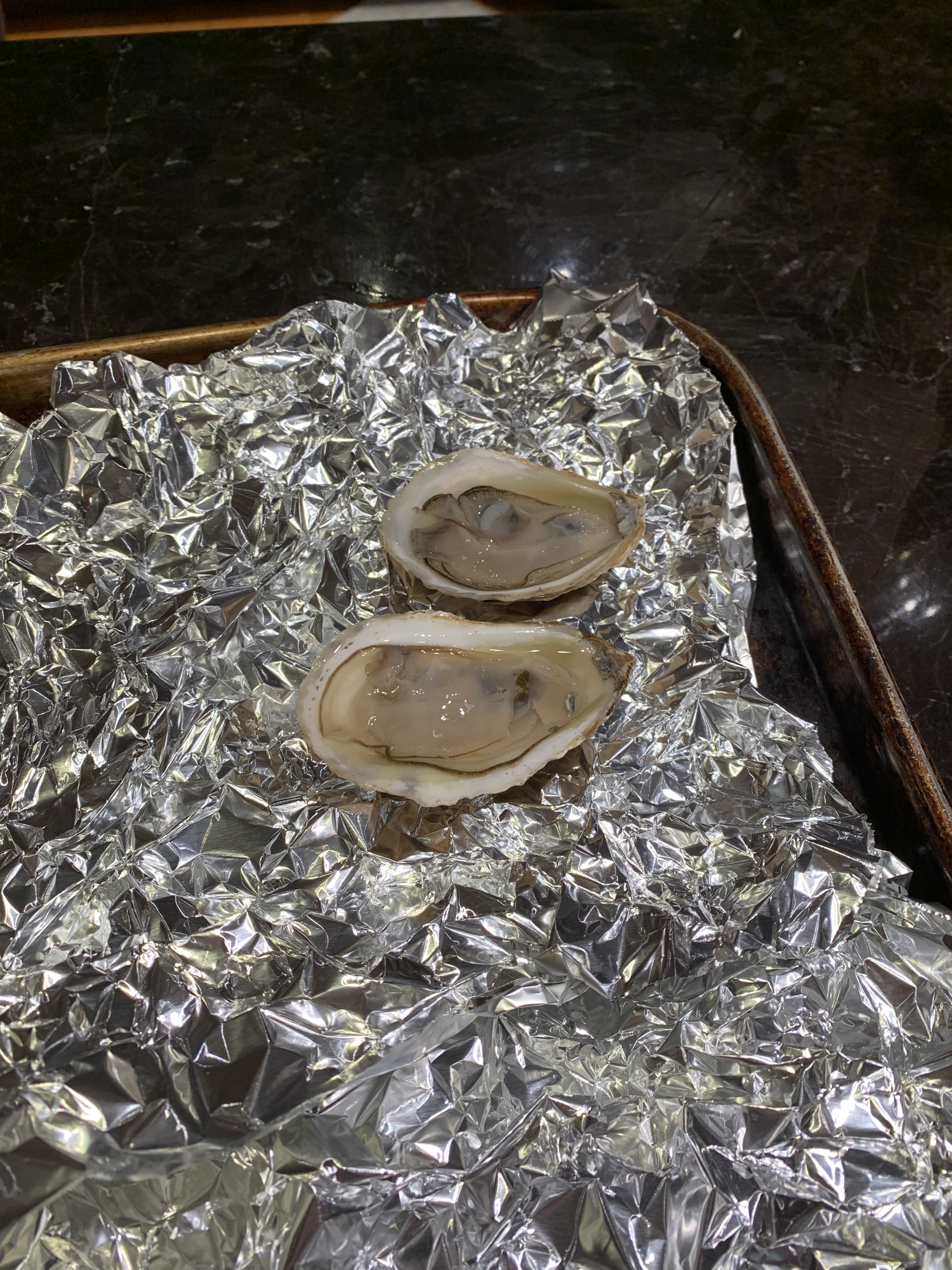 None of us had ever shucked an oyster before, but with the help of a tutorial from America’s Test Kitchen on YouTube, my cousin-in-law quickly picked it up. I even shucked one, having trouble getting the knife into it. The oysters gave off their nautical scent as soon as the shells were off, whereas they were not very fragrant before. We cooked them as the recipe instructed, but two minutes short of the twelve it requested. Also, the recipe tells you to put them on a bed of rock salt. That’s not available for a cheap price, so we opted for the much more economical crumpled foil method, which works just as well.