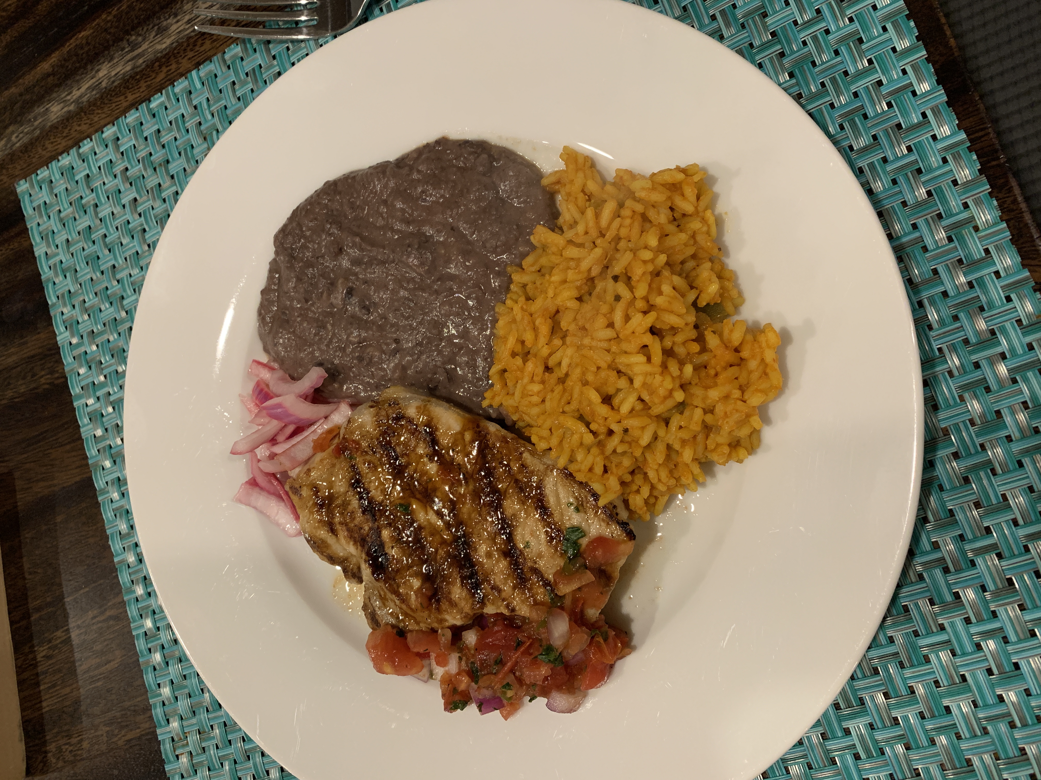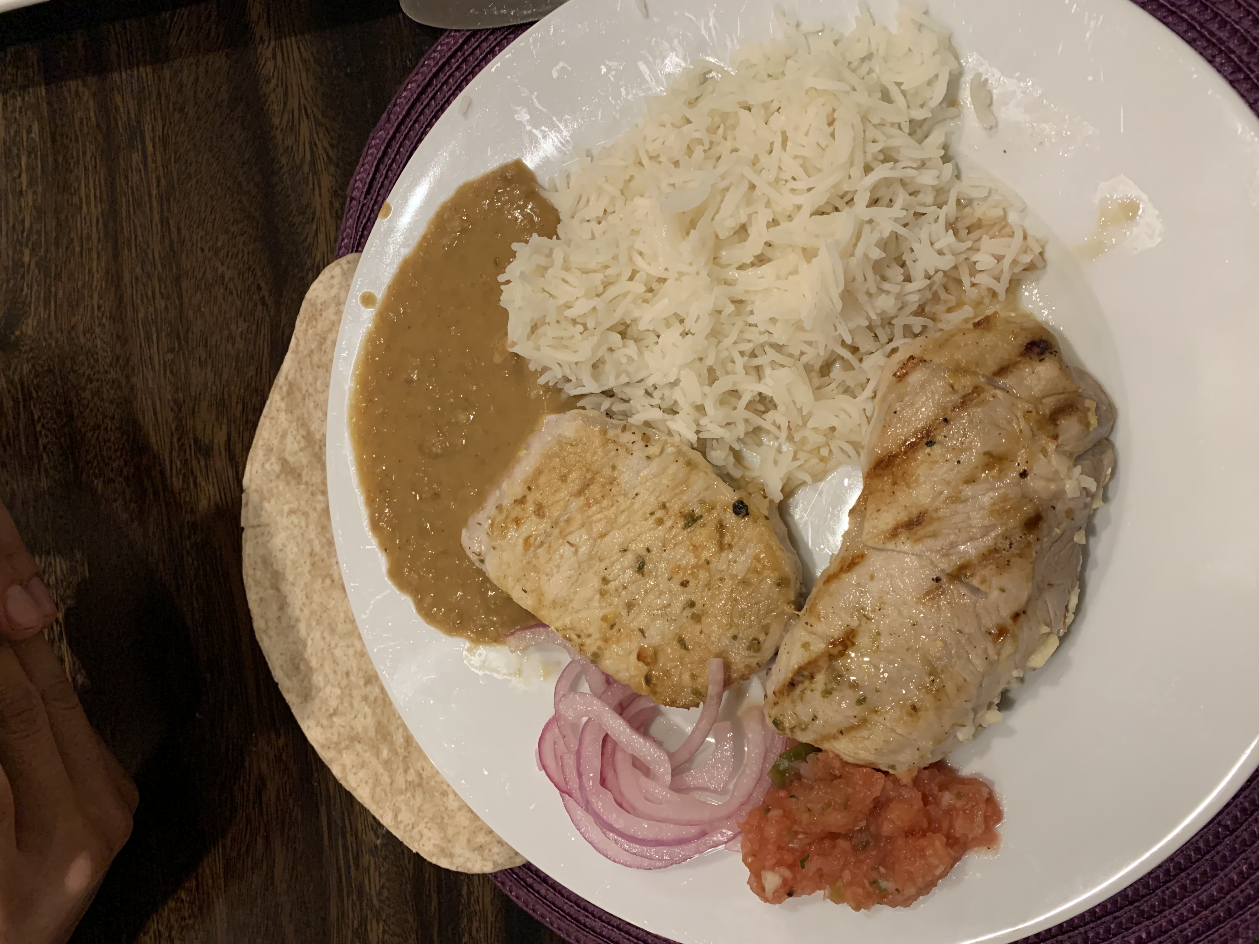 For my second attempt, I prepared refried black beans (which I have more often than pinto), pickled onion and Laura Vitale’s Mexican Yellow Rice with modifications. I got smaller, thinner pork chops and ensured I pounded them to equal thickness, seared them correctly, made a more textured salsa (although with the onions, which you add separately, chunkier than I intended). I didn’t have tortillas or avocados, so I didn’t serve them with this. I used a red onion with the salsa, when the recipe calls for white, because it’s what I had, but I didn’t use the whole onion in the salsa.