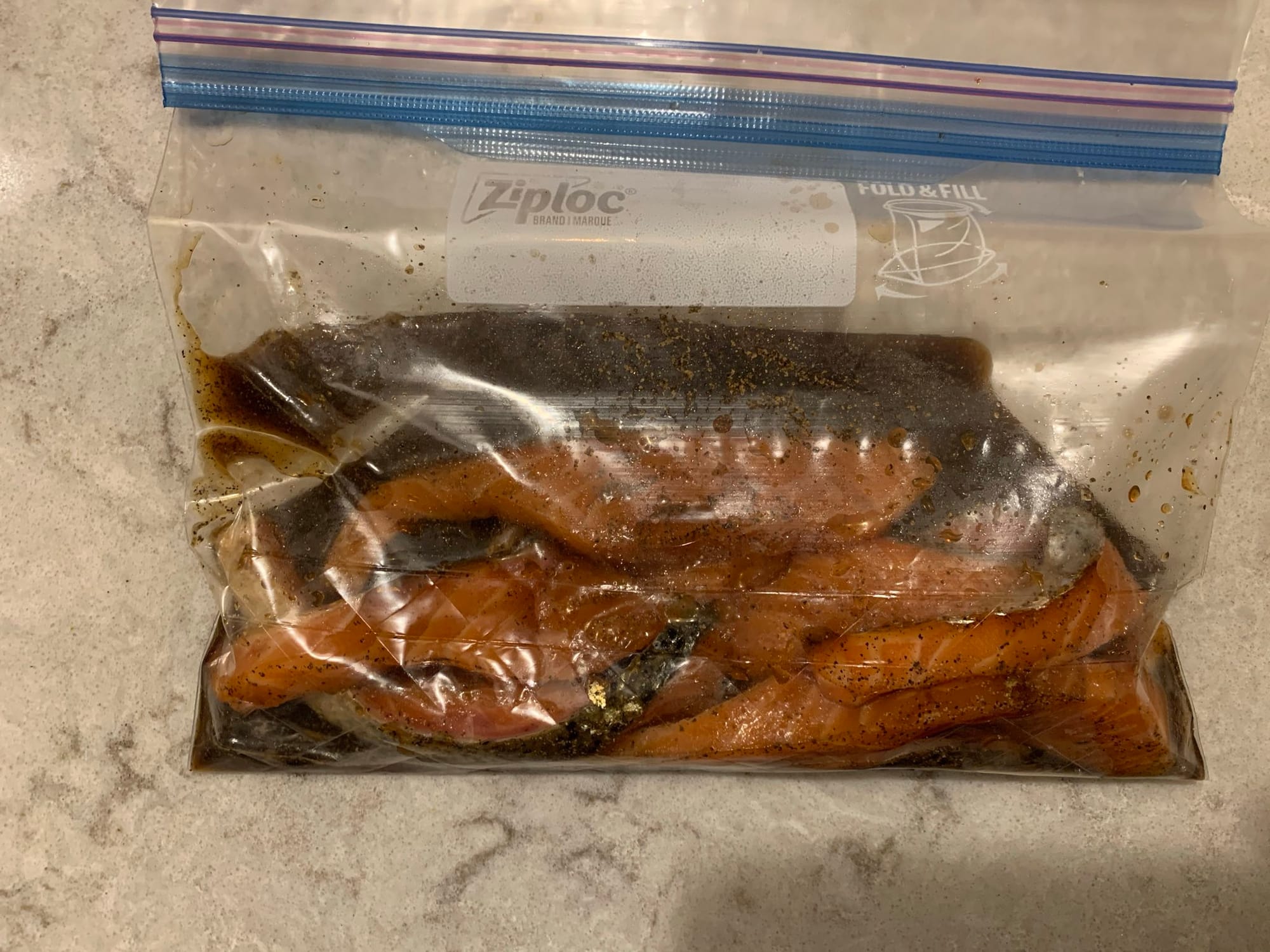 Jerky is a common staple snack at gas stations and other roadside stops. If you can make it yourself, it's definitely much better than what you would get there. The ingredients are pretty simple and you probably have most of them already. The only one I didn't have is Liquid Smoke, but it was easy enough to find. Actually, this was the first time I'd ever cooked with it. You freeze the salmon for half an hour, then cut it into thin strips and marinate them in Liquid Smoke and other flavorful ingredients.