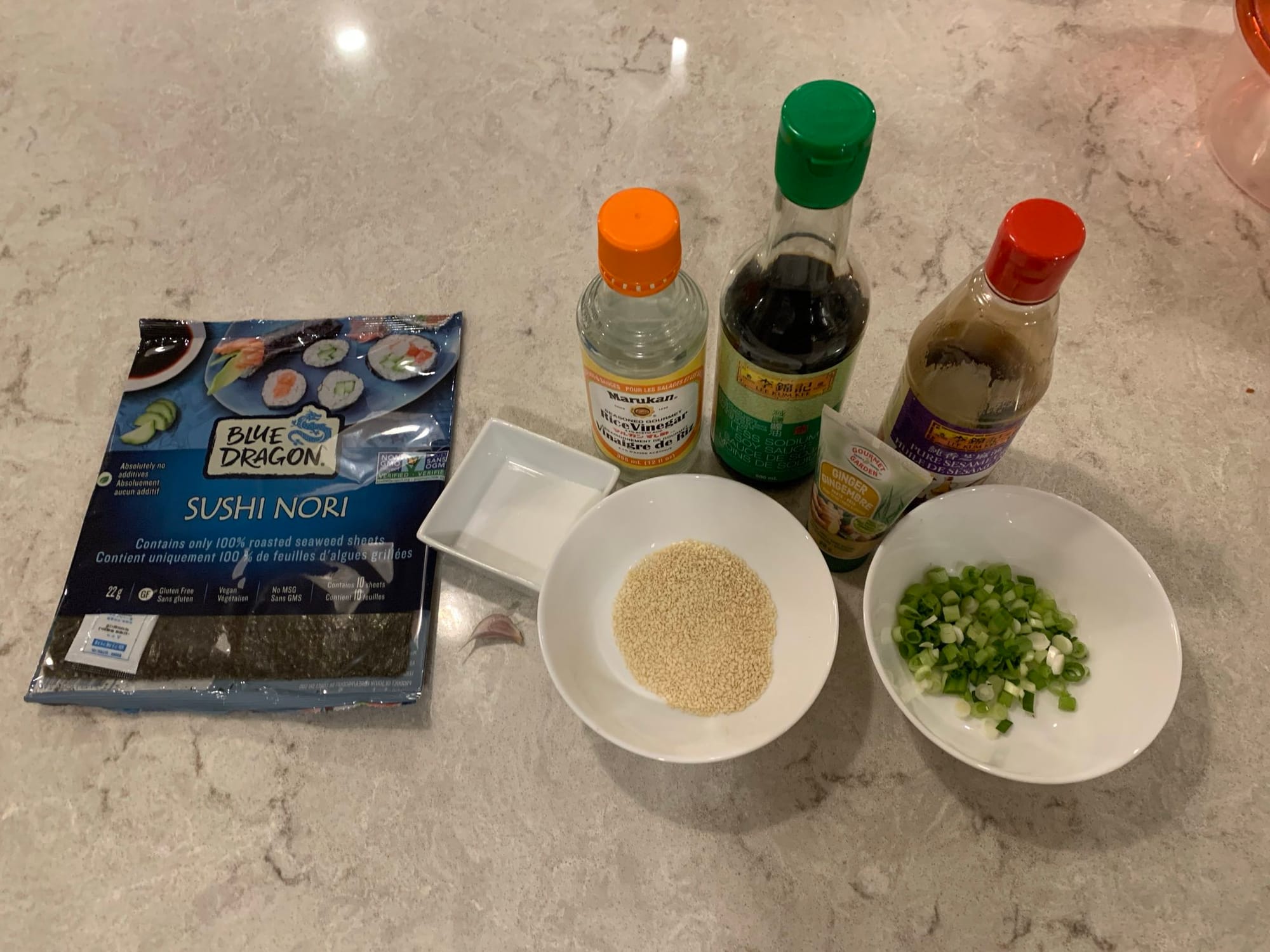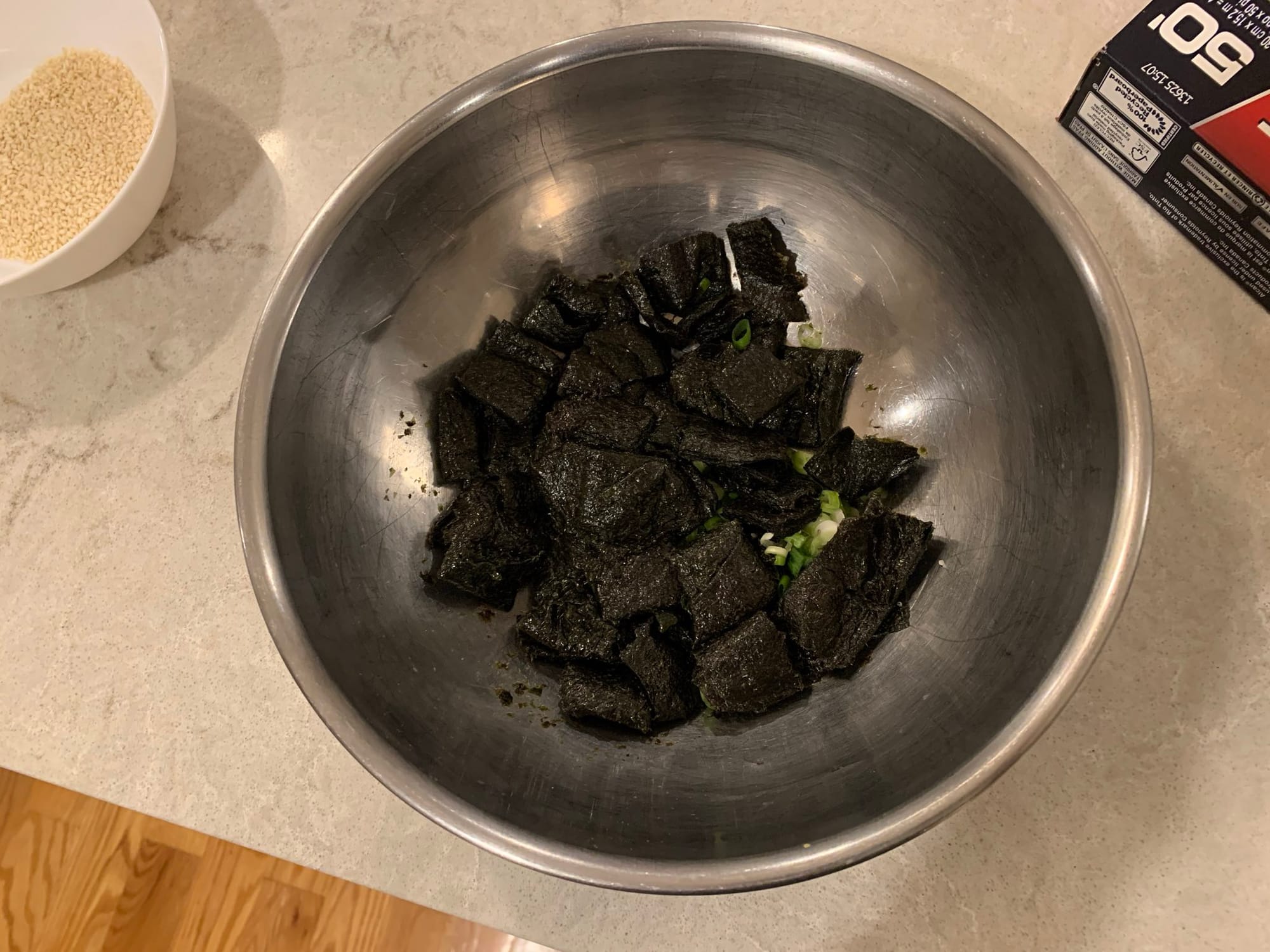 This recipe comes together in a cinch. All you do is soak your seaweed sheets for 10 minutes, mix up a dressing, chop up a few scallions/green/spring onions, mix them and you're done. I got a package of 10 seaweed sheets. The one ingredient I had to substitute, by my own fault, was rice vinegar. I didn't quite have a tablespoon left of that and had to sub the rest with white wine vinegar. It was close enough.