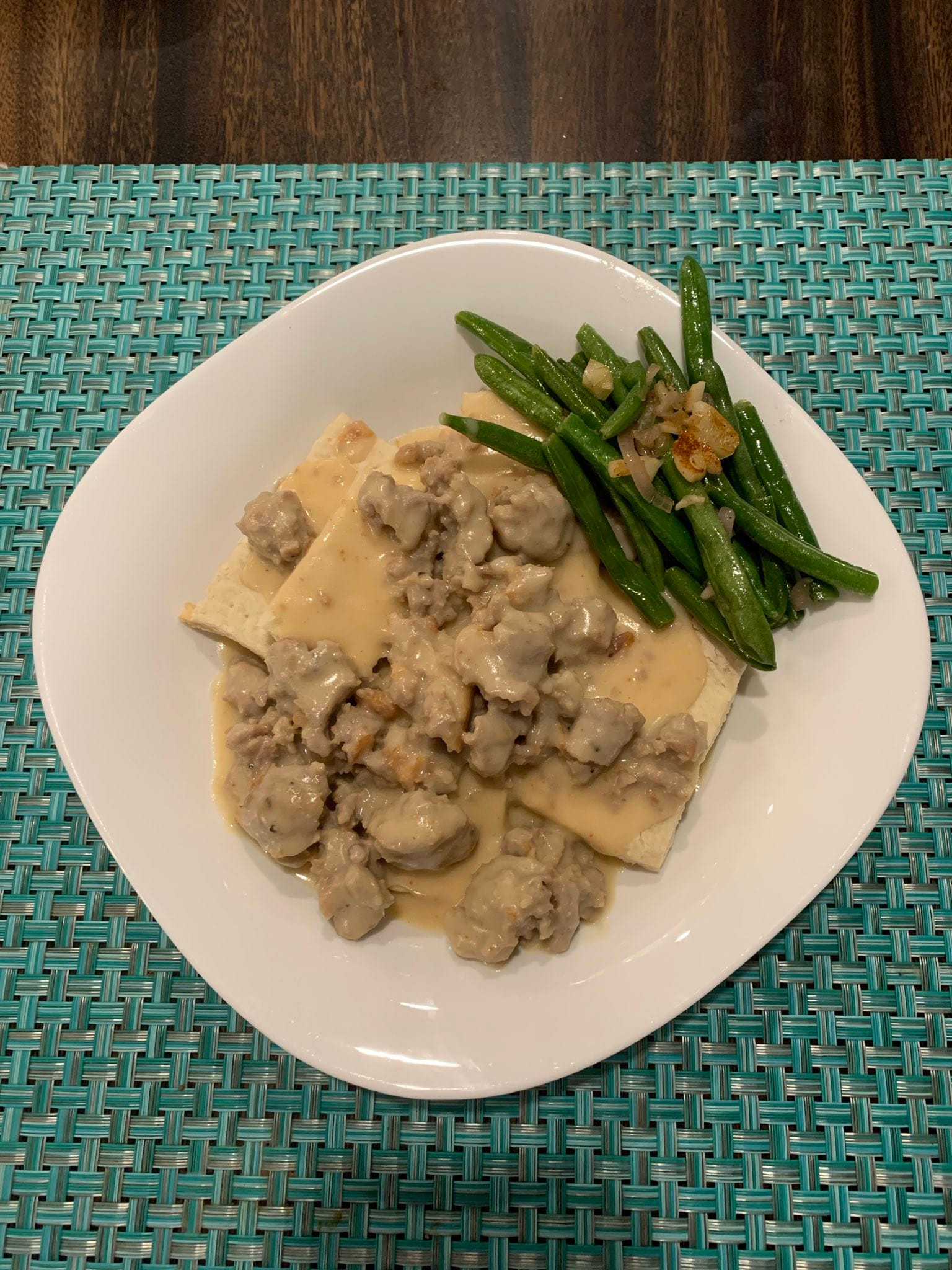 If you want to make this recipe for Sledging Biscuits yourself, you can find it in Tomb Raider: The Official Cookbook and Travel Guide. If you want to make the sausage gravy, the recipe I used was from The Salty Marshmallow, using half beef stock and half light cream. For the green beans, I simply sautéd them in olive oil with a sliced shallot and some garlic.