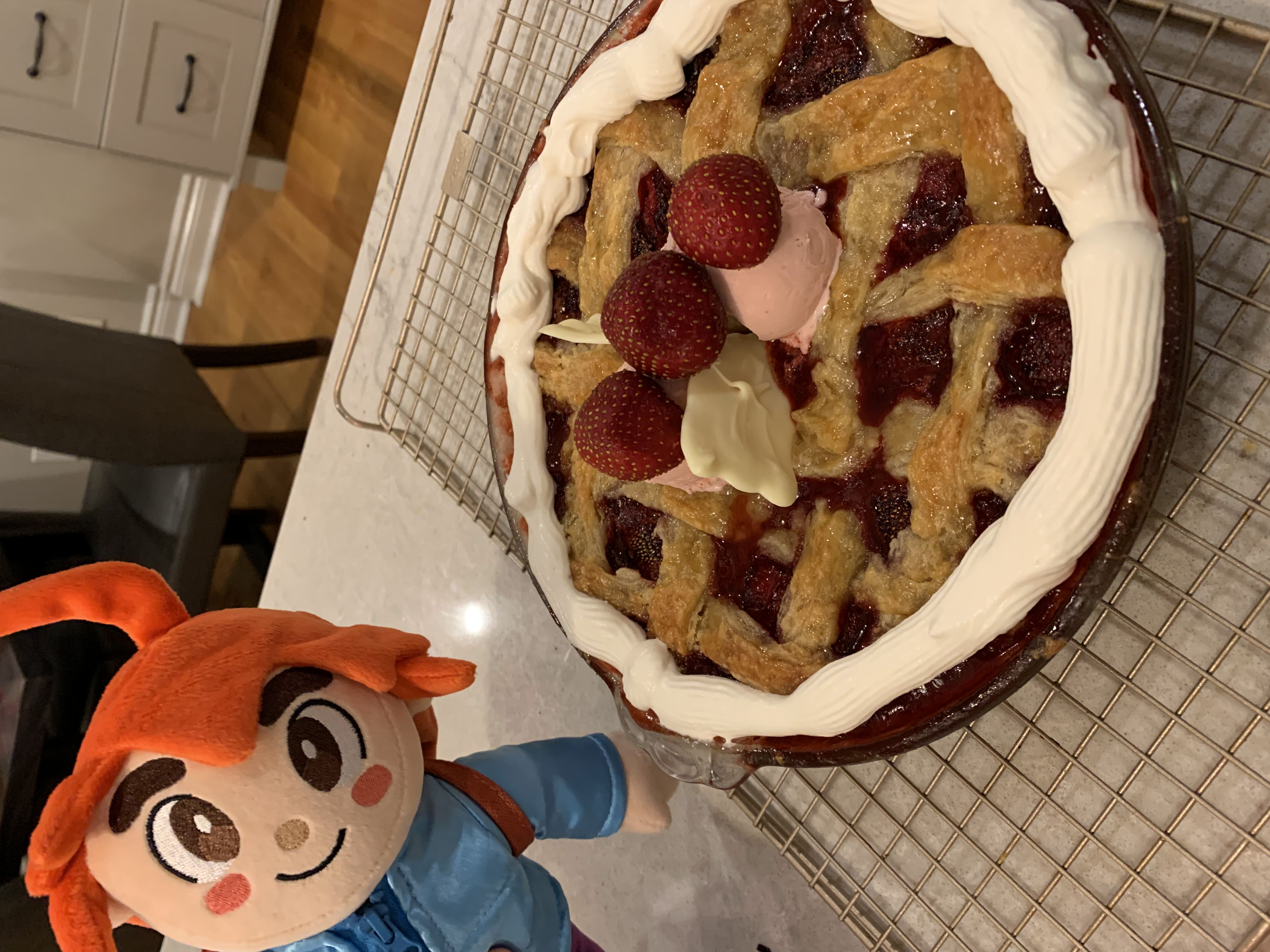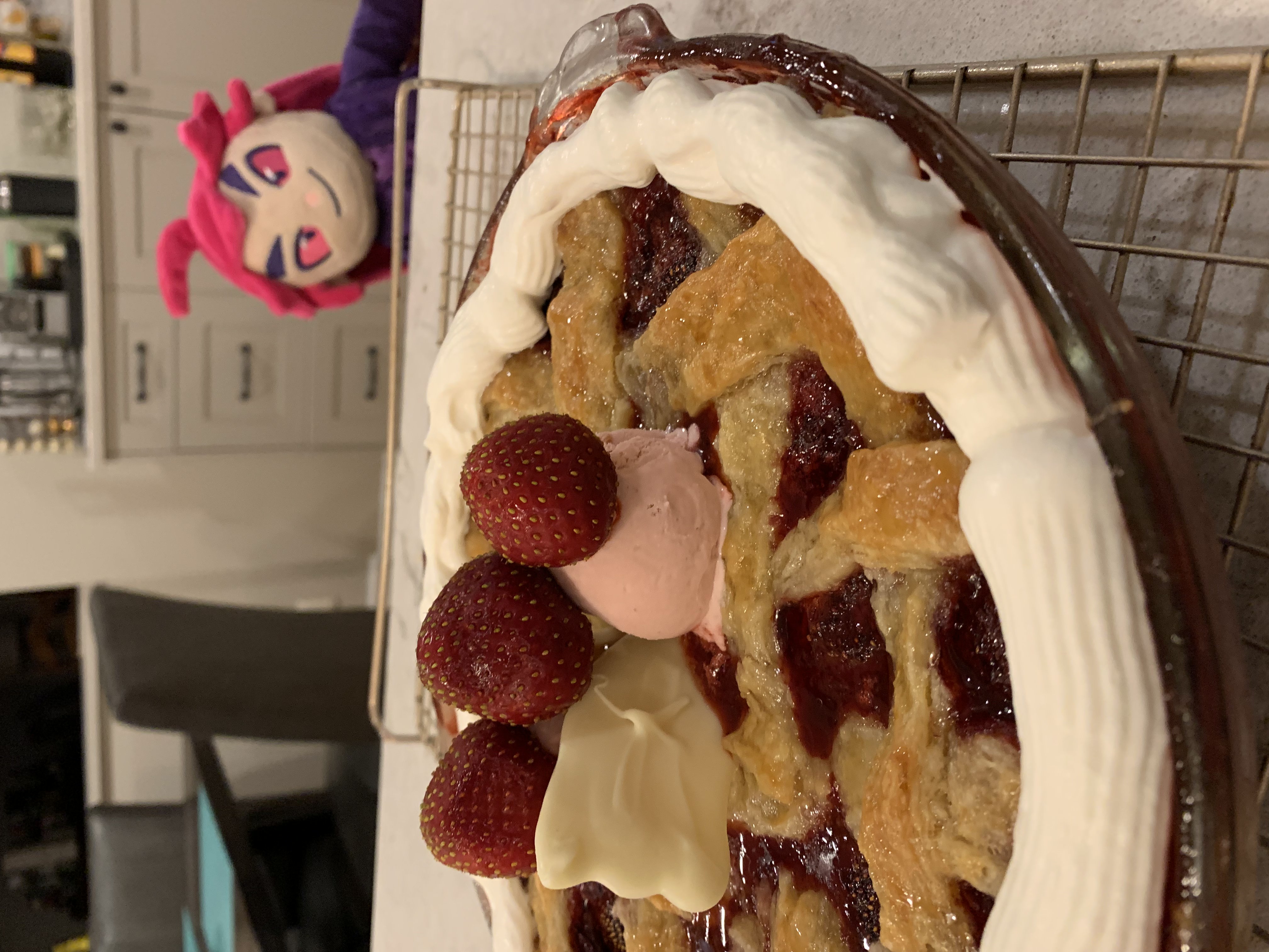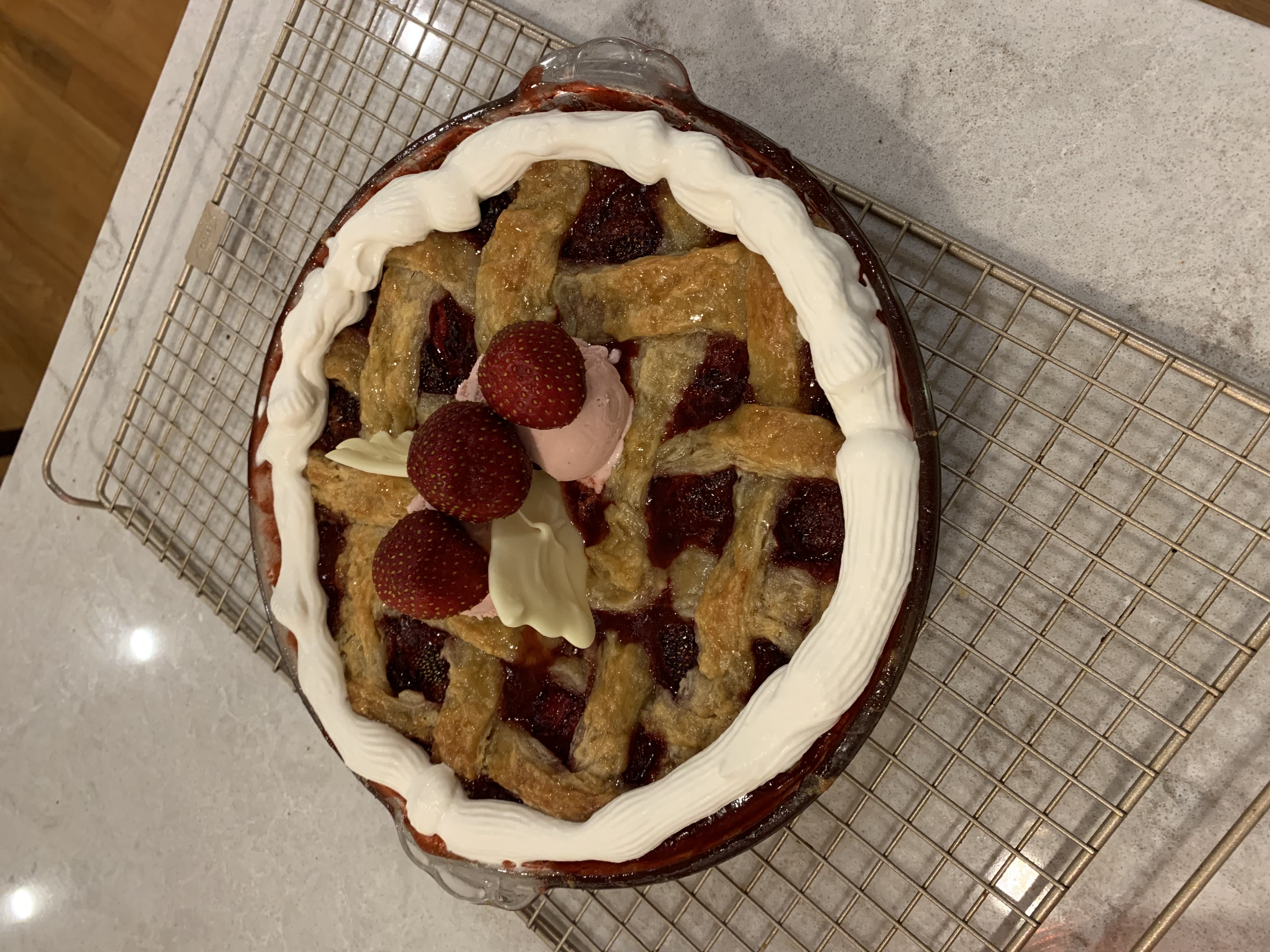 The Perfect Run pie is topped with a lattice crust, a ring of whipped cream on the crust, two scoops of strawberry ice cream, and three whole strawberries, one of which has wings.